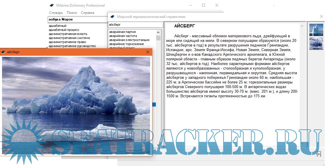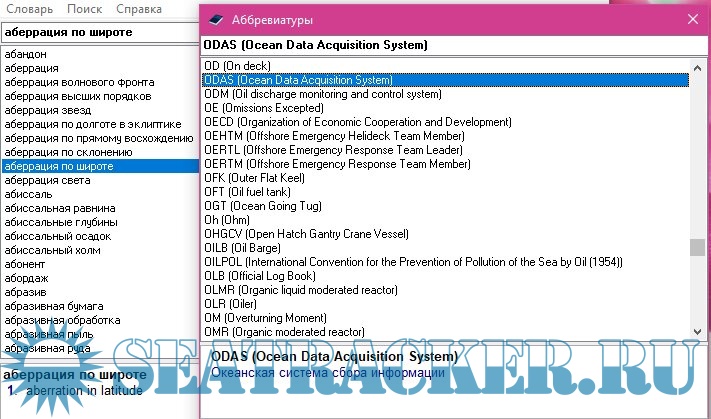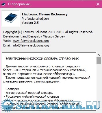 Описание: Electronic Marine Dictionary Russian-English - Russian This version of the electronic dictionary contains English-Russian and Russian-English maritime terminology, the most common abbreviations used in maritime practice, shipbuilding, marine engineering and radio communications. The reference (encyclopedic) materials covering the main marine terms are collected, some of which are accompanied by relevant illustrations. The total number of marine terms and abbreviations collected in the dictionary is more than 60,000.