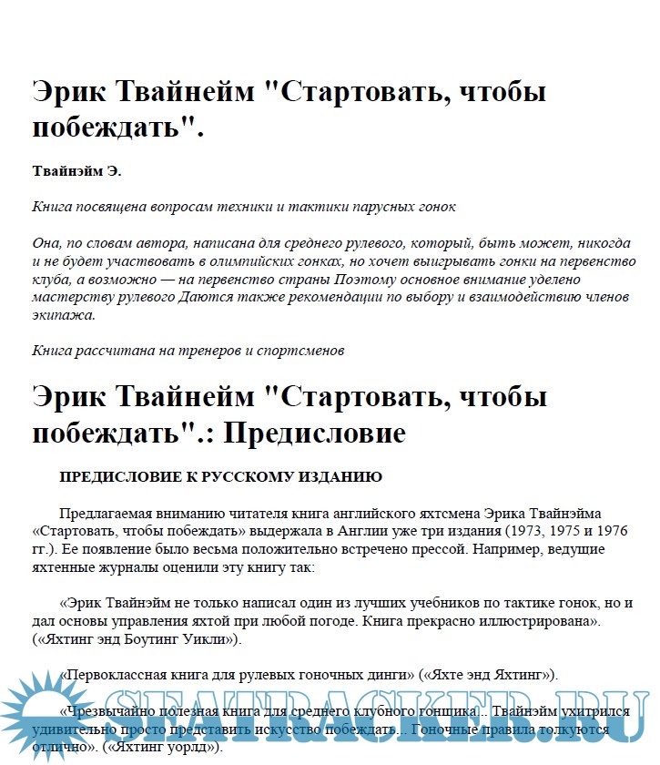Год выпуска: 1988 Язык: русский Автор: Эрик Твайнэйм Жанр: Практическое пособие Издательство: Физкультура и спорт Формат: PDF Качество: Распознанный текст без ошибок (OCR) Количество страниц: 125 Описание: Книга посвящена вопросам техники и тактики парусных гонок Она, по словам автора, написана для среднего рулевого, который, быть может, никогда и не будет участвовать в олимпийских гонках, но хочет выигрывать гонки на первенство клуба, а возможно — на первенство страны Поэтому основное внимание уделено мастерству рулевого. Даются также рекомендации по выбору и взаимодействию членов экипажа. Книга рассчитана на тренеров и спортсменов.