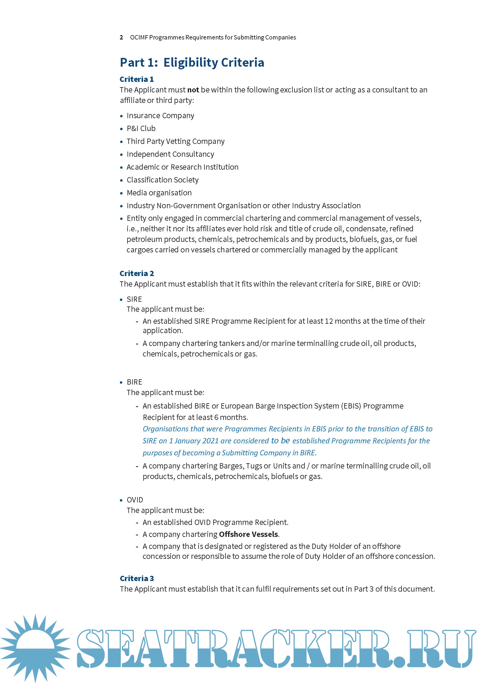 Description: This document sets out the criteria for a company to be considered for approval as a Submitting Company in SIRE, BIRE and OVID. It also sets out the requirements for retaining Submitting Company status on an ongoing basis.