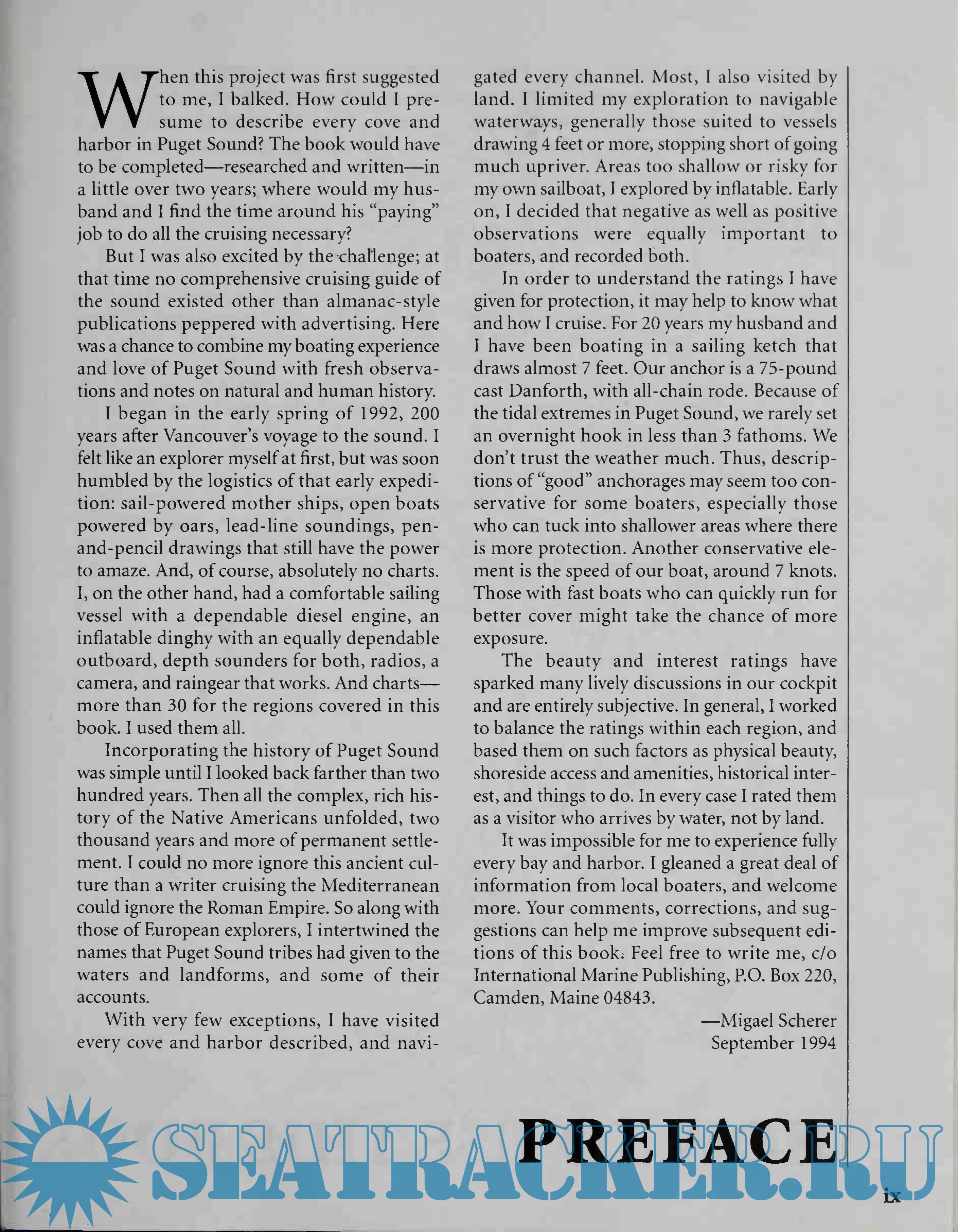 Year: 1995 Language: english Author: Migael M. Scherer Genre: Guide Publisher: TAB Books Edition: First ISBN: ISBN 0-07-055285-1 Format: PDF & EPUB Quality: Scanned pages Pages count: 422 Description: Puget Sound is one of the largest and most attractive cruising grounds in North America, more varied by far than even veteran cruisers suspect—great natural harbors, breathtaking scenery, and a mild climate that permits year-round cruising. Here is the comprehensive boater's guide to the almost 2,000 miles of shoreline and more than 300 islands that lie between Washington's capital of Olympia and the Canadian border at Point Roberts, including the San Juans. Veteran Pacific Northwest cruiser and award-winning author Migael Scherer brings more than 20 years of Puget Sound ailing to this guide, offering intricate, hard-earned local knowledge of the approaches anchorages, and facilities of hundreds of bays, harbors, and inlets, with annotated charts for many. Here also are insights into local history and attractions, and a rating system that details every harbor and anchorage, how and where to get ashore, and what facilities to expect. A Cruising Guide to Puget Sound shows you not only where to cruise but how to make your cruise safer and more enjoyable, with a detailed discussion of weather, tides, currents, and the effects of commercial shipping, logging, and fishing. Migael Scherer is a graceful, meticulous, and observant writer whose love and appreciation of all that Puget Sound offers rings clearly. Here is her personal tour.