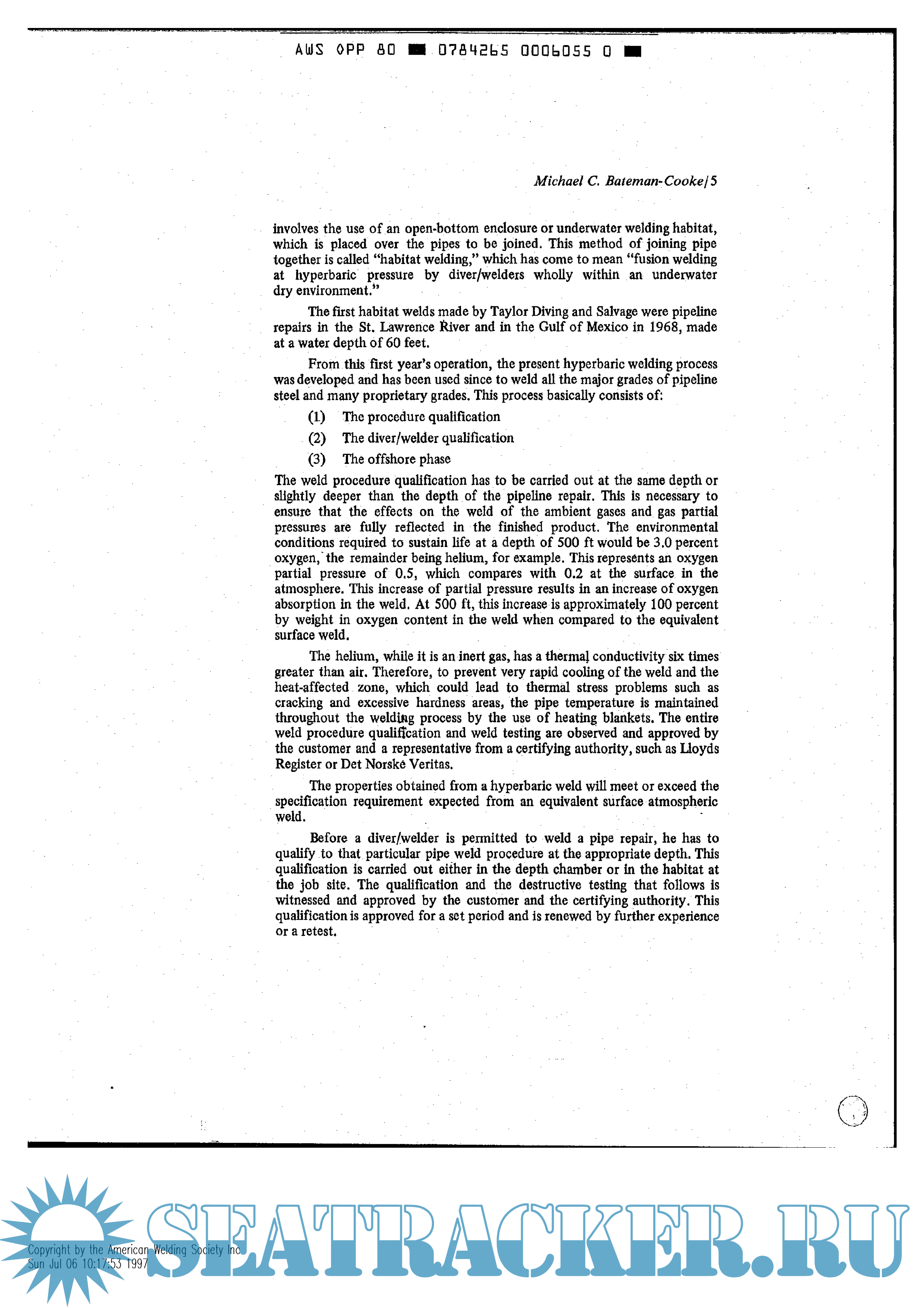 Year: 1981 Language: english Author: American Welding Society Genre: Guide Publisher: American Welding Society ISBN: 0871712156 Format: PDF Quality: Scanned pages Pages count: 188 Description: Any professional who has ever participated in the performance of a deepwater hyperbaric weld will certainly agree that the successful welded connection, repair, and attachment of two pieces of steel in a dry environment is still one of maybe the most ambitious and challenging project with which the diving industry of today is confronted. This book is aimed to provide all required technical guidance on various aspects of underwater welding. It is a highly detailed and informative reference source offering an insight in the important technology applied in the design and further construction of the offshore platforms and pipelines. The content of the volume covers the welding processes that can commonly be adapted to the underwater environment, established maintenance and repair procedures proven effective, safety matters, info on diving options and associated equipment, and the AWS RP for the underwater welding. The problems commonly encountered in underwater welding have also been dealt with and analyzed together with the most important factors that affect the welding metallurgy, and many other interesting issues that every underwater welder shall be well aware of.