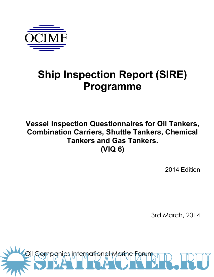 Year: 2014 Language: english Author: OCIMF Genre: Practical guide Publisher: Oil Companies International Marine Forum Edition: 3rd March, 2014 Format: PDF Quality: eBook Pages count: 167 Description: Vessel Inspection Questionnaires for Oil Tankers,Combination Carriers, Shuttle Tankers, Chemical Tankers and Gas Tankers. (VIQ 6) In 1993, OCIMF established a Ship Inspection Report (SIRE) Programme, which enabled OCIMF members to submit their ship inspection reports to OCIMF for distribution to OCIMF members and certain qualifying non-OCIMF members. Participation in the original programme, as either an inspecting OCIMF Member or a programme recipient, was strictly voluntary and each programme recipient determined independently how to evaluate the information contained in the reports received from OCIMF. Under the SIRE Programme, the operator of any ship that is the subject of a report was given a copy of that report and the opportunity to submit written comments relating to the report, to both the inspecting OCIMF Member and to OCIMF. Report recipients accessed the SIRE System Index by computer and this permitted the index to be viewed or downloaded. Programme recipients could order reports and any matching operator comments from the SIRE system. Reports and comments were transmitted by facsimile to the programme recipients' pre-registered facsimile numbers on request.