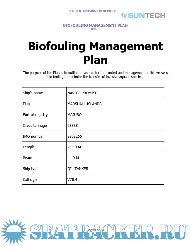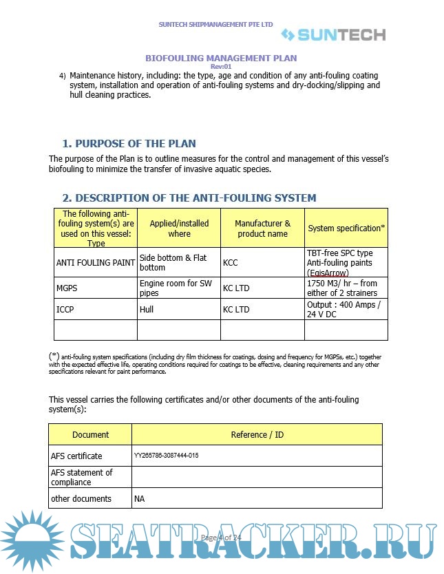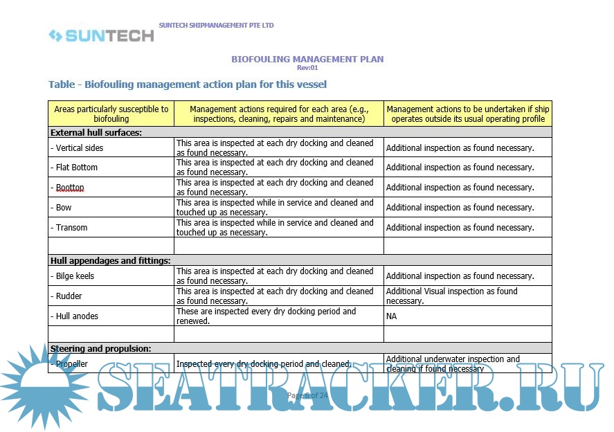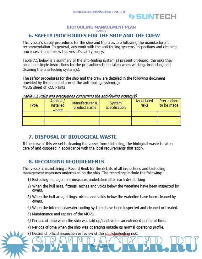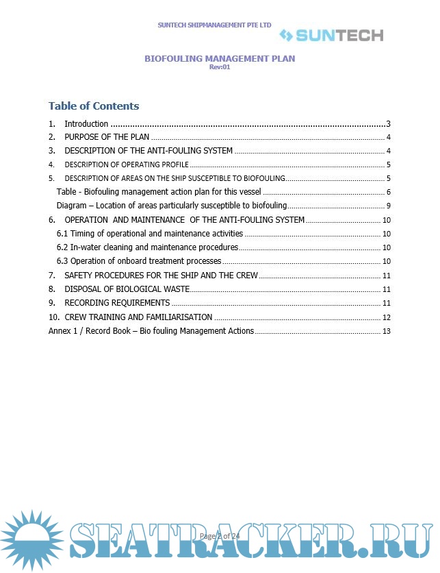 Year: 2021 Language: english Author: Suntech Ship Management Genre: Manual Format: DOC Quality: eBook Pages count: 24 Description: The Plan is following the outline given in the IMO guideline, MEPC.207(62), dated 15 July 2011, entitled 2011 guidelines for the control and management of ship’s biofouling to minimize the transfer of invasive aquatic species. The Plan shall be readily available to any Port State Authority for viewing on request. Annex 1 of this plan includes a sample of the Record Book, where this vessel’s crew document activities performed for biofouling maintenance.