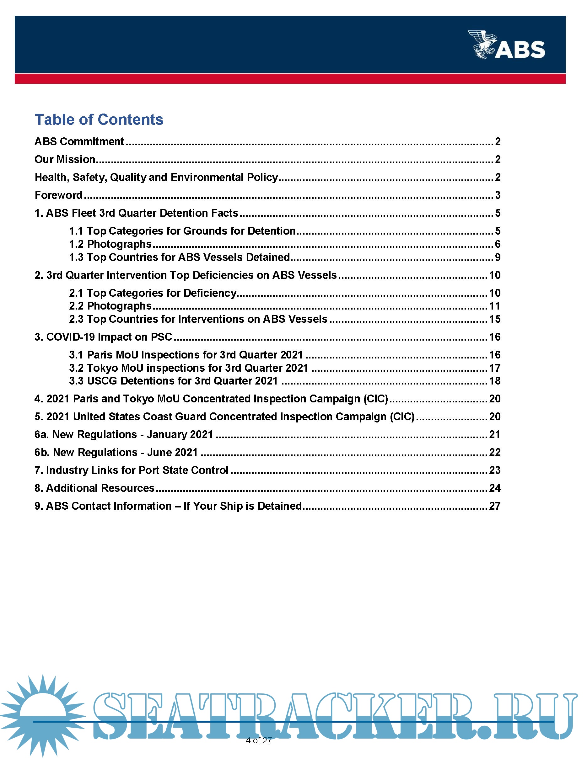 Description: This ABS Quarterly Report on Port State Control (PSC) provides information to owners on deficiencies identified on ABS vessels during inspections carried out by the various PSC regimes globally during the 3rd Quarter of 2021. This report is being made available to assist owners by providing awareness of potential areas of concern that have been identified on ABS classed vessels.