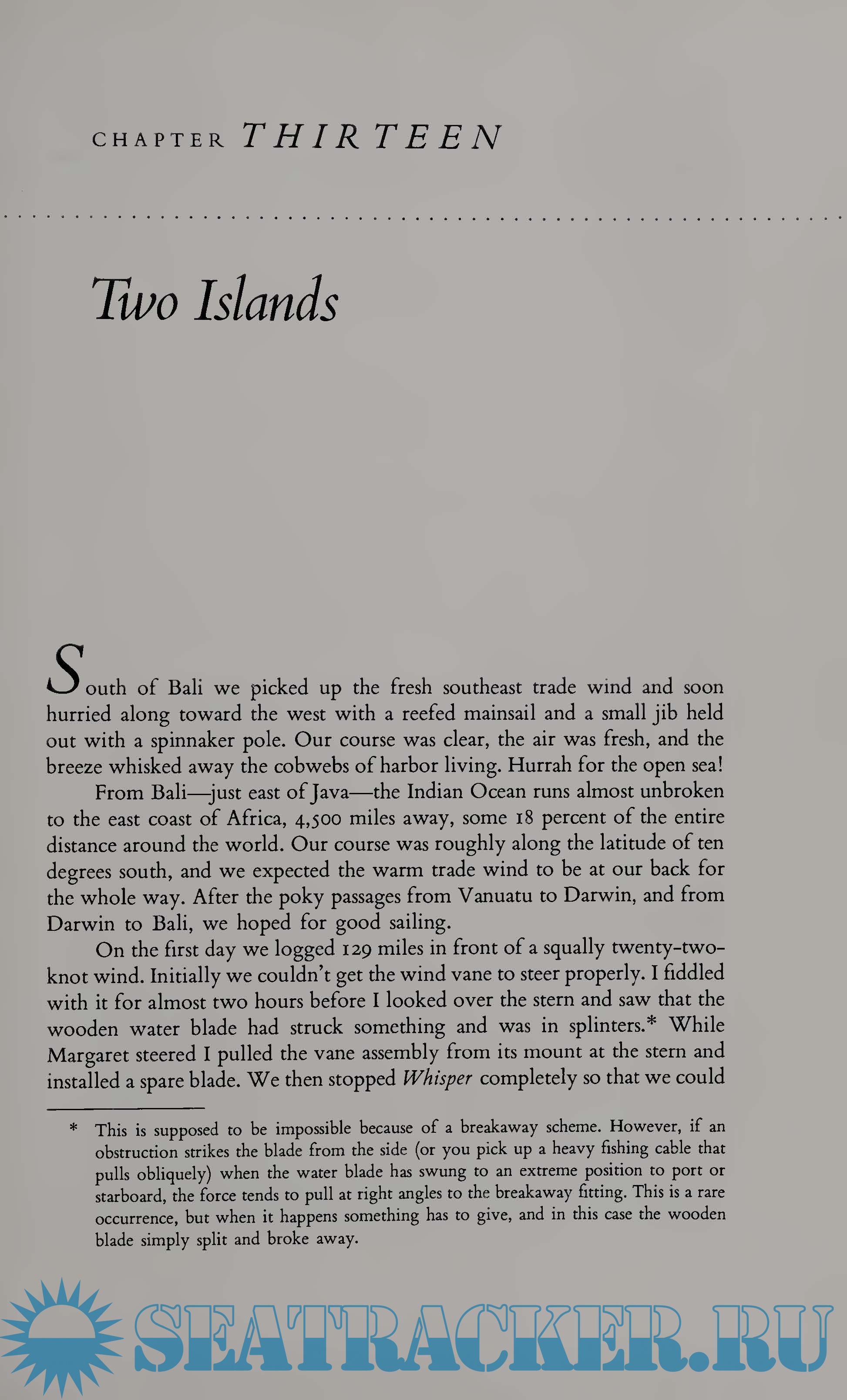 The Roths followed the classic trade- wind sailing route via Panama, the Torres Strait, the Red Sea, and the Suez, stopping at twenty countries (including eight recently independent). Here are lighthearted anecdotes about the people they met along the way, touches of history, adventure, and much nuts-and-bolts sailing information. This is a concise, upbeat, and instructive book about the liner points of foreign travel and small yacht handling under sail, a discipline Roth clearly loves.