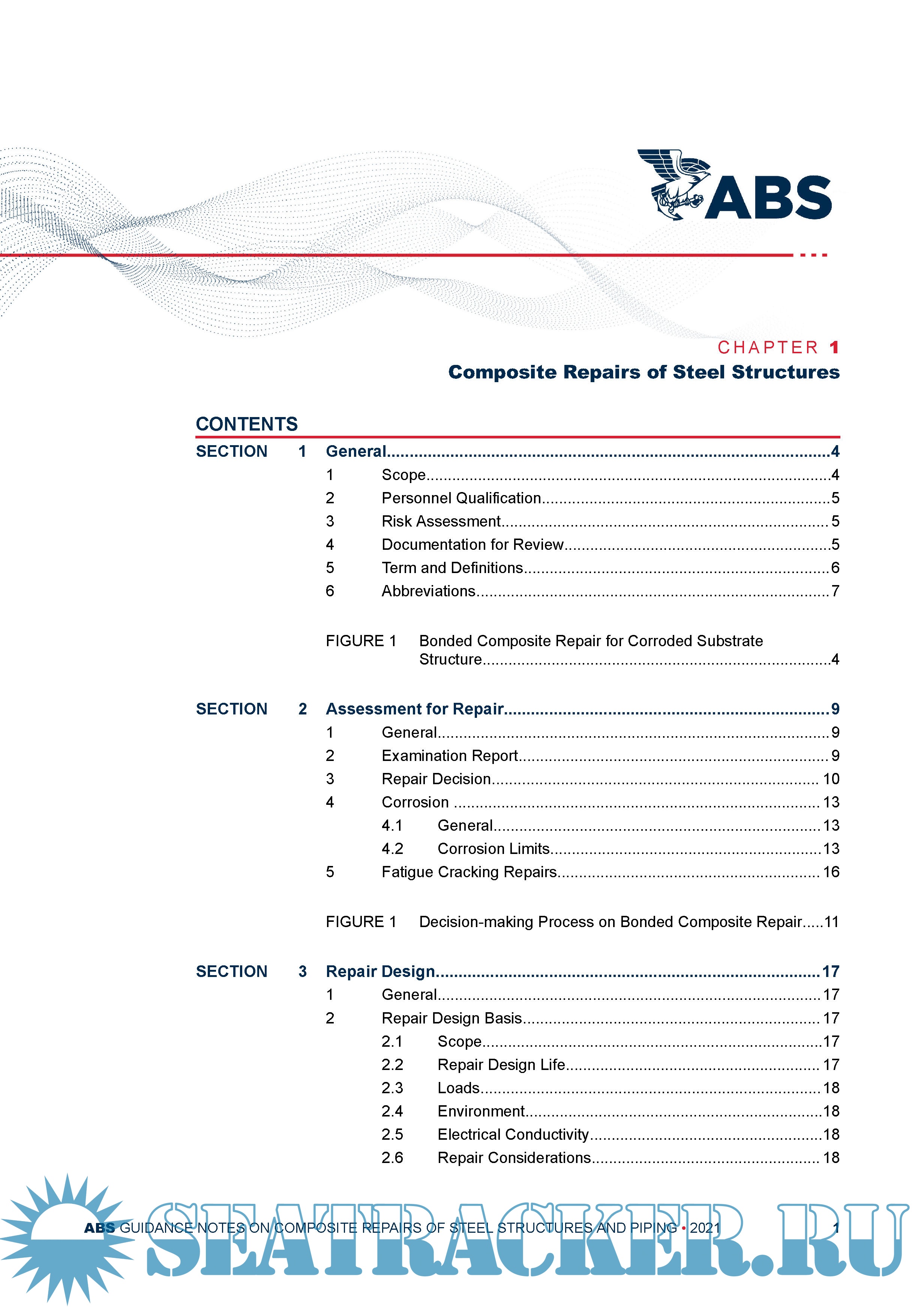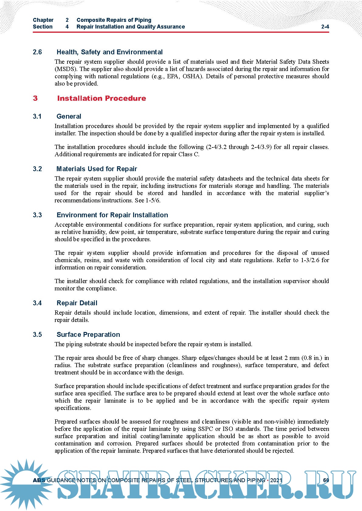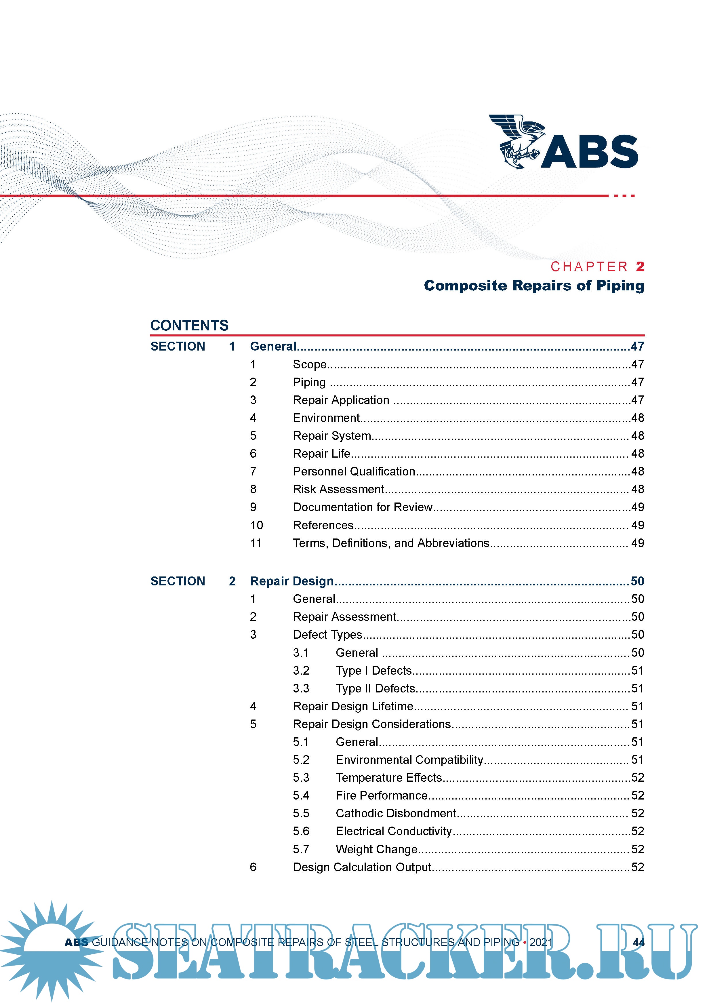 Year: 2021 Language: english Author: ABS Genre: Guide Format: PDF Quality: eBook Pages count: 71 Description: This Chapter is applicable to the use of composite repairs on site-specific offshore units such as FPSOs and FSOs. It provides guidelines on adhesively bonded composite repairs of the steel structures. It covers assessment, design, qualification, installation and inspection of a bonded repair. This Chapter does not cover aluminum structures, even though this guidance may also be applicable to aluminum structure repairs. These Guidance Notes provide an alternative to regular hot work renewal, where the hot work is considered risky to the offshore unit´s operation. Instead of using hot welding, an existing degraded steel structure can be repaired to restore the integrity of the structure by utilizing patches of composite material, steel plates, or other structural materials that are bonded to the degraded steel structure. Release Date: August, 2021