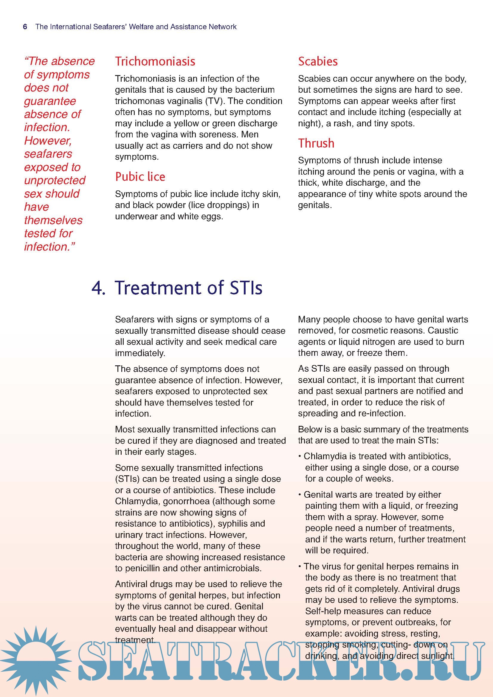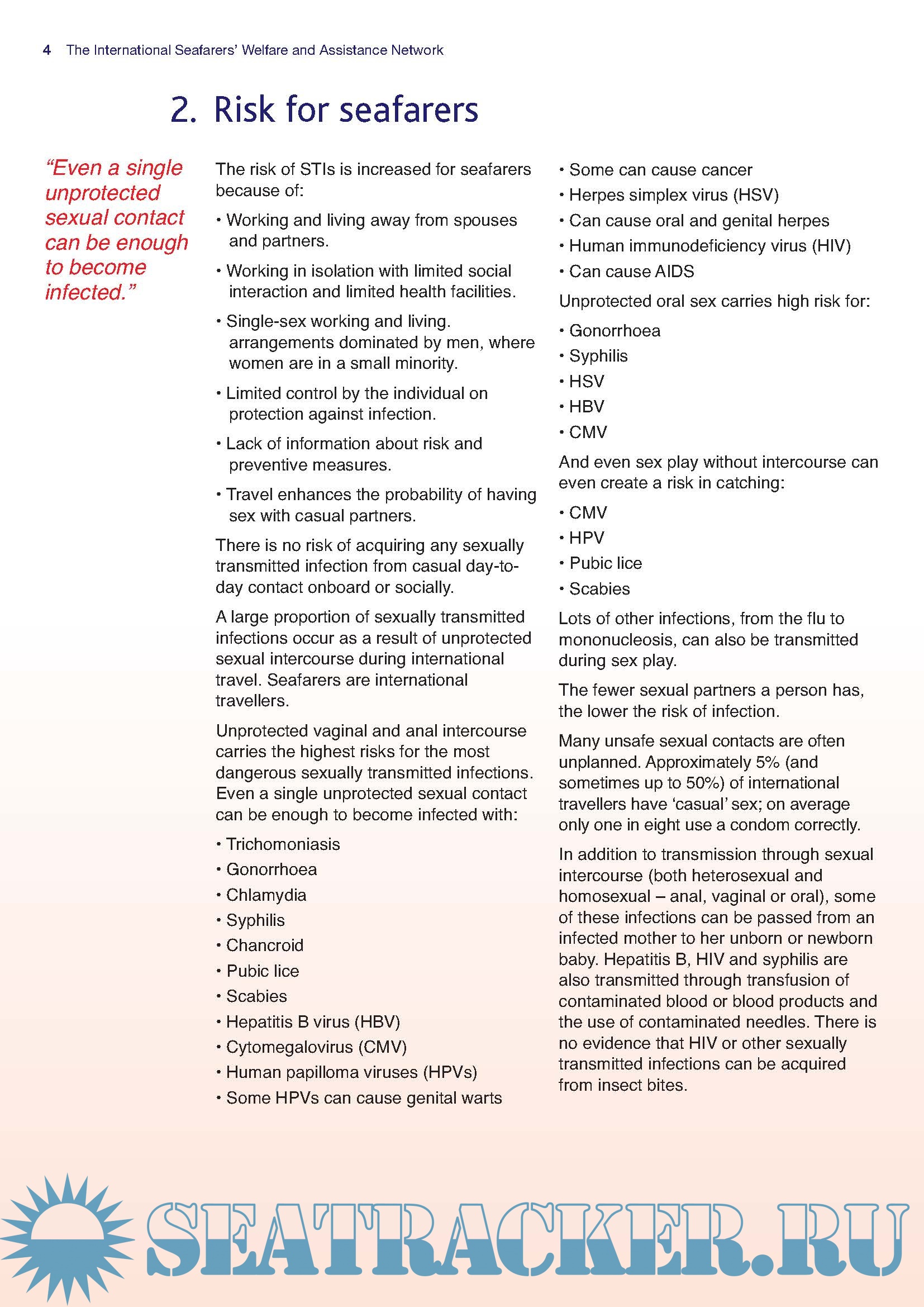This guide encourages seafarers to look after their own sexual health. It provides information on the symptoms and treatment of common STIs, as well as HIV/AIDS, and the precautions seafarers should take. Seafarers should protect themselves against sexually transmitted infections when travelling.