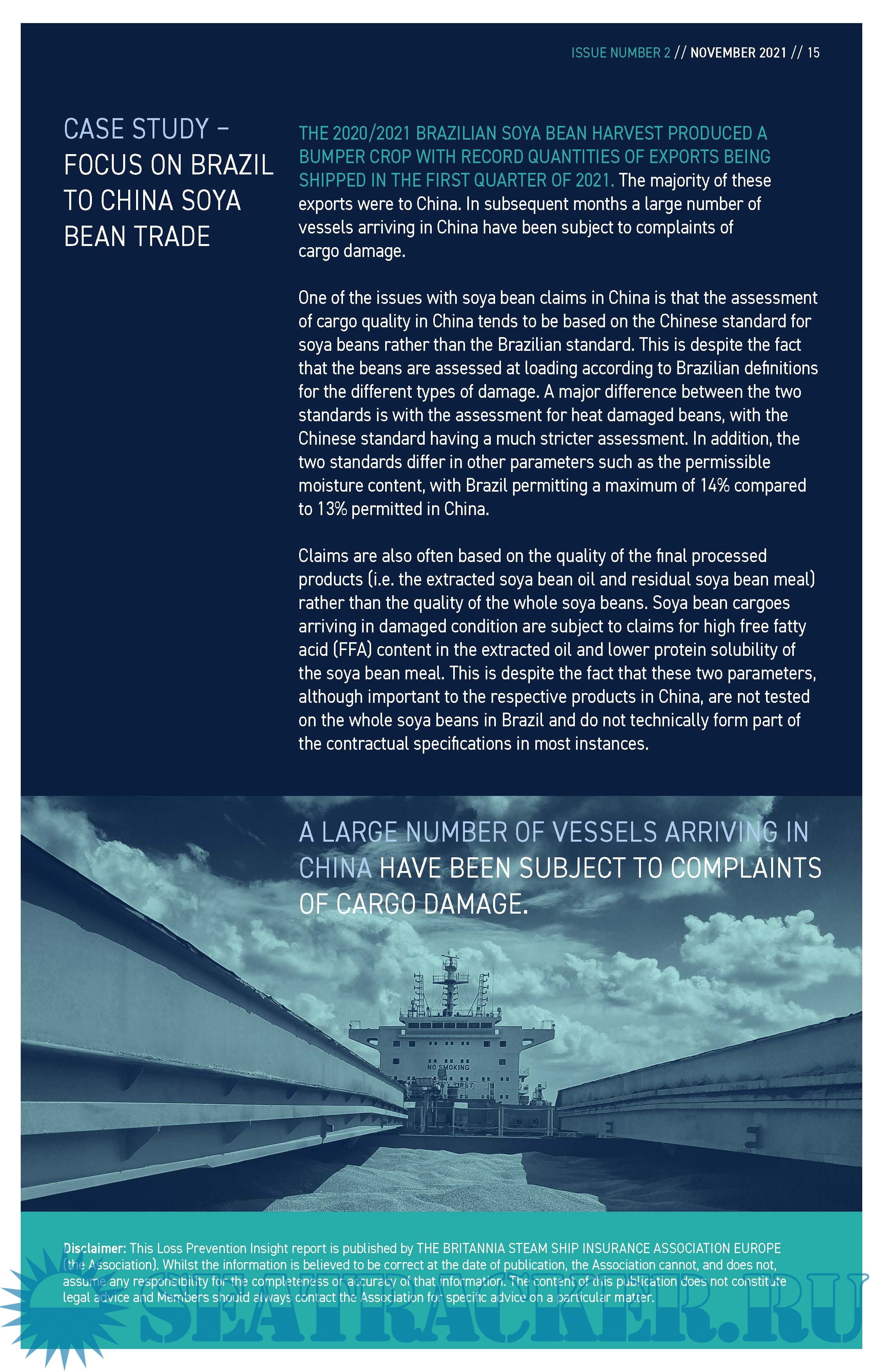 Year: 2021 Language: english Author: Britannia P&I Club Genre: Periodical (magazine) Format: PDF Quality: eBook Pages count: 16 Description: Issue Number 2 | Published: 9 November 2021 Britannia P&I Club Loss Prevention insight - Carriage of Grain and Oilseed Cargoes an Overview for the Maritime Sector. The following report provides some guidance on the main precautions to be considered when carrying bulk grains and oilseeds, points to consider in the event of damage being found at the destination and concludes with a brief case study covering various issues relating to soya bean claims.