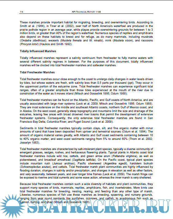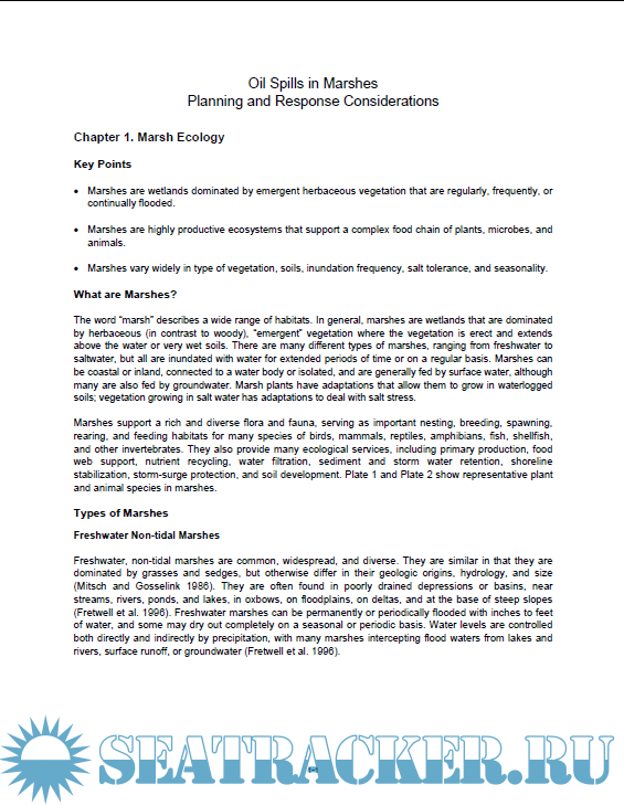 Description: This report is intended to assist those who work in spill response and planning where fresh and salt marshes are at risk of oil spills. By understanding the basics of the ecology of marshes and learning from past oil spills in marshes, we can better plan for, protect, and make appropriate decisions for how to respond to future oil spills. Along coastal areas, marshes occur in intertidal to supratidal zones, and the marsh fringe is often contaminated by spills on water. In many areas of the country, pipelines cross under, through, or adjacent to marshes, making them at risk of interior oiling.