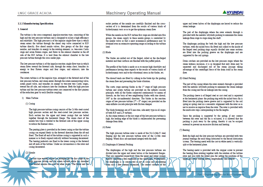 Year: 2007 Language: english Author: Hyundai Genre: Manual Format: PDF Quality: eBook Pages count: 250 Description: GRACE ACACIA is a LNG carrier built in 2007 by HYUNDAI HEAVY INDUSTRIES CO. LTD. - ULSAN, SOUTH KOREA. Currently sailing under the flag of Bahamas. It's gross tonnage is 100341 tons DWT 85214 tons Cargo Tanks capacity 149730 mc. - Engine output Kw 29420