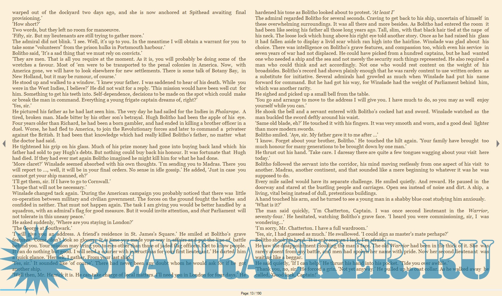 Year: 2006 Language: english Author: Alexander Kent Genre: Fiction Publisher: Arrow Books ISBN: 9781409062257 Format: EPUB Quality: eBook Pages count: 380 Description: 1784: at a time when most of the fleet is laid up, His Majesty's frigate Undine weighs anchor at Spithead to begin a voyage to India and far beyond. As her new captain, Richard Bolitho is glad to go, despite the nature of his orders and the immensity of the voyage - for he is leaving an England still suffering from the aftermath of war. But he is to learn that signatures on proud documents do not necessarily make a lasting peace, and finds himself involved in a conflict as ruthless as the one which had given him his first command during the war with France. In an uneasy peace, the expansion of trade and colonial development in little-known areas of the East Indies soon push aside the pretence and bring the guns' fury into the open. There is no set line of battle or declared cause to rally Undine's small company, but the dangers and the endless demands have to be faced by the man who commands the only King's ship available. Bolitho's adventures continue in Passage to Mutiny.