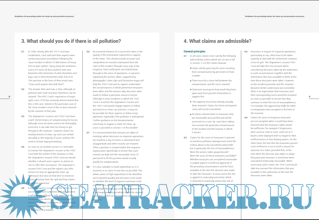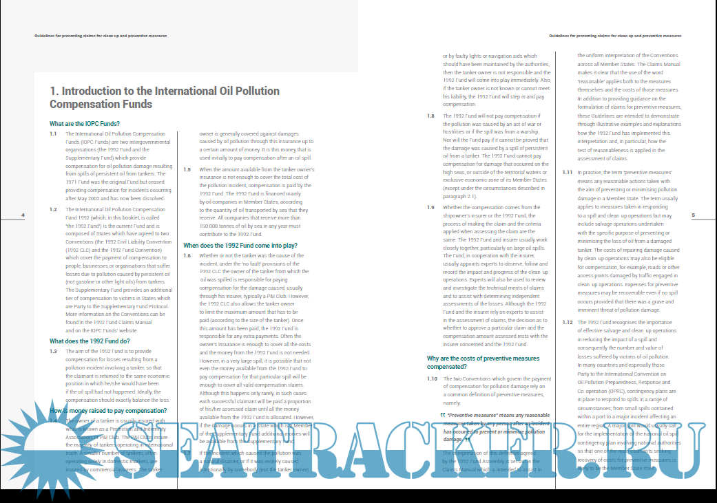 Year: 2018 Language: english Author: IOPC FUND Genre: Guide Format: PDF Quality: eBook Pages count: 21 Description: When the amount available from the tanker owner’s insurance is not enough to cover the total cost of the pollution incident, compensation is paid by the 1992 Fund. The 1992 Fund is financed mainly by oil companies in Member States, according to the quantity of oil transported by sea that they receive. All companies that receive more than 150 000 tonnes of oil by sea in any year must contribute to the 1992 Fund.