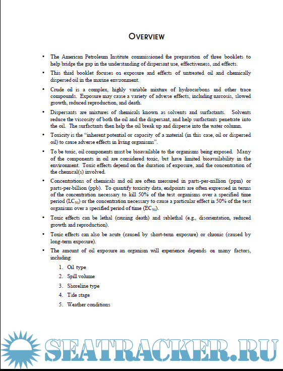 Description: The American Petroleum Institute commissioned the preparation of three booklets to help bridge the gap in the understanding of dispersant use, effectiveness, and effects. This third booklet focuses on exposure and effects of untreated oil and chemically dispersed oil in the marine environment.