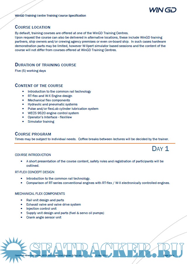 Description: This Operation Advanced Training (5 Days) is aimed for marine engineers and technical staff involved directly or indirectly in operation and supervision of above listed WinGD engine types taking into consideration various bore segments and the common Engine Control System WECS-9520.