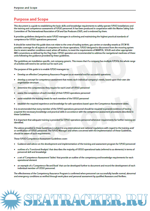 Description: This document is a guide to establishing the basic skills and knowledge requirements to safely operate F(P)SO installations and the training and competence assessment of F(P)SO personnel. It has been produced in cooperation with the Marine Safety Sub-Committee of The International Association of Oil and Gas Producers (OGP), and is endorsed by them.