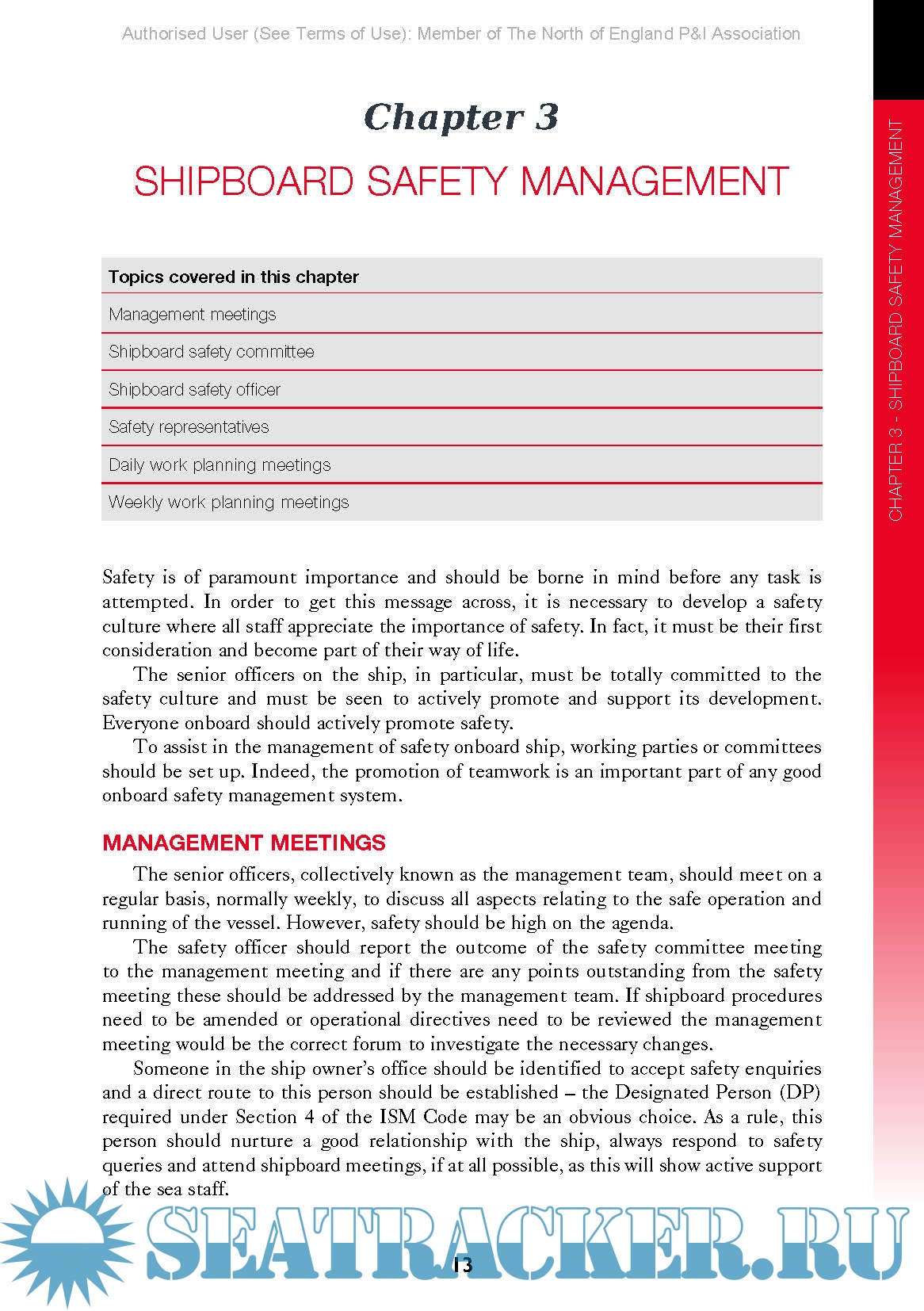 The International Safety Management (ISM) Code requires all ships to implement a Safety Management System, to include procedures, plans, instructions and checklists for key shipboard operations. This guide complements the SMS and is designed to raise awareness of onboard hazards and promote onboard safety culture.