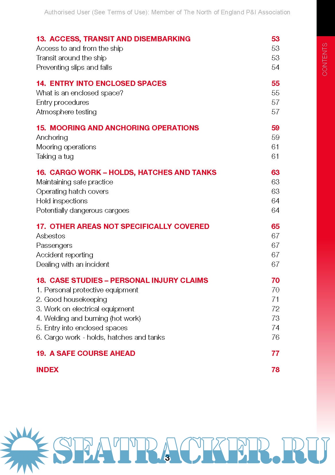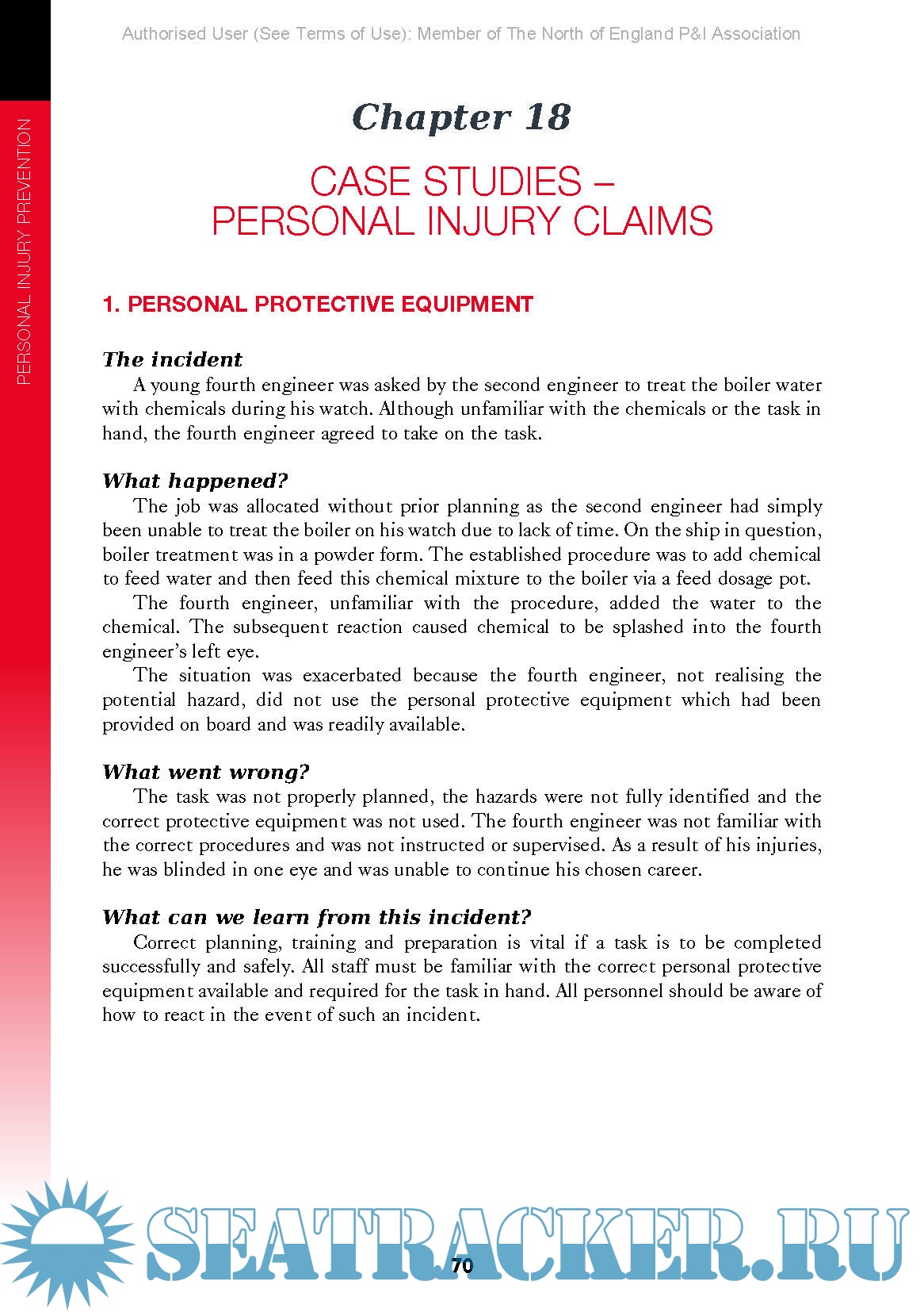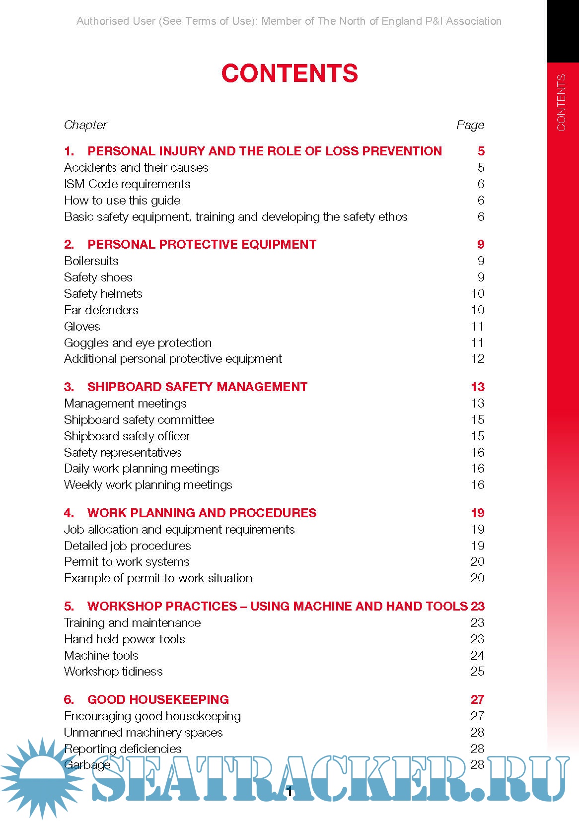 Year: 2015 Language: english Author: Richard Bracken Genre: Guide Publisher: North P&I Club Edition: 2nd Reprinted in 2015 (electronic version) ISBN: 9780954201272 Format: PDF Quality: eBook Pages count: 87 Description: This guide highlights onboard operations that present a risk to personal safety and sets out recommended personal protective equipment (PPE) and best working practices. It looks at the roles and procedures required for effective onboard safety management and advises how to develop an onboard safety culture. The guide is illustrated with cartoons demonstrating good and bad practice. The International Safety Management (ISM) Code requires all ships to implement a Safety Management System, to include procedures, plans, instructions and checklists for key shipboard operations. This guide complements the SMS and is designed to raise awareness of onboard hazards and promote onboard safety culture. The book identifies the key safety practices that should be implemented on every ship, including shipboard safety management, work planning and use of personal protective equipment (PPE). It discusses a number of onboard operations, including electrical maintenance, handling shipboard chemicals, use of lifting equipment, hot work, enclosed space entry, mooring operations, cargo handling and galley work. It describes the potential hazards and sets out safeguards and best practices. The book includes case studies relating to variety of personal injury claims. They examine the cause of each incident and the lessons to be learnt. HOW TO USE THIS GUIDE This guide details a range of safe practices which, if adopted on board ship, will help reduce the high number of accidents and injuries experienced by many seafarers. In essence, what must be developed is a safety culture. Safety and accident prevention is really a four stage process. It is necessary to: • Identify the problem •Provide all personnel with basic training and basic personal protective equipment •Develop a safety culture – where safety becomes a priority consideration •Develop accident, incident and near miss reporting systems. This guide is intended as an additional weapon in the fight against accidents – particularly personal injuries. It is not intended as an alternative to thorough training. The competency of seafarers to correctly use safety equipment and to be fully aware of onboard safety procedures is of paramount importance. With the common goal of reducing the cost of personal injury in both human and financial terms, everyone has a responsibility and a role to play. This obviously includes you – the reader! :