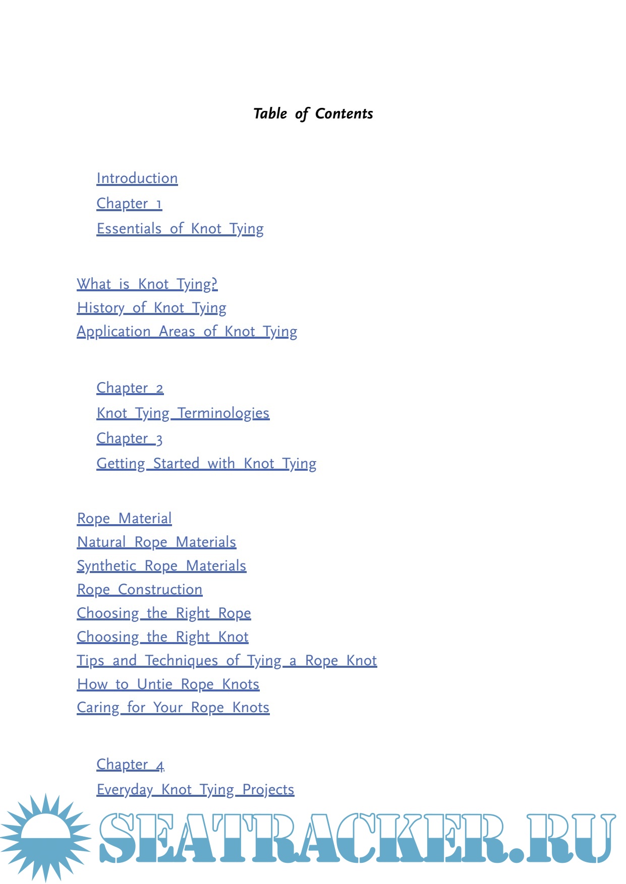 25 everyday knot tying projects (such as fisherman's knot, camping knot, hiking knot, sailing knot, etc.) with step-by-step instructions and graphical illustrations to get you started