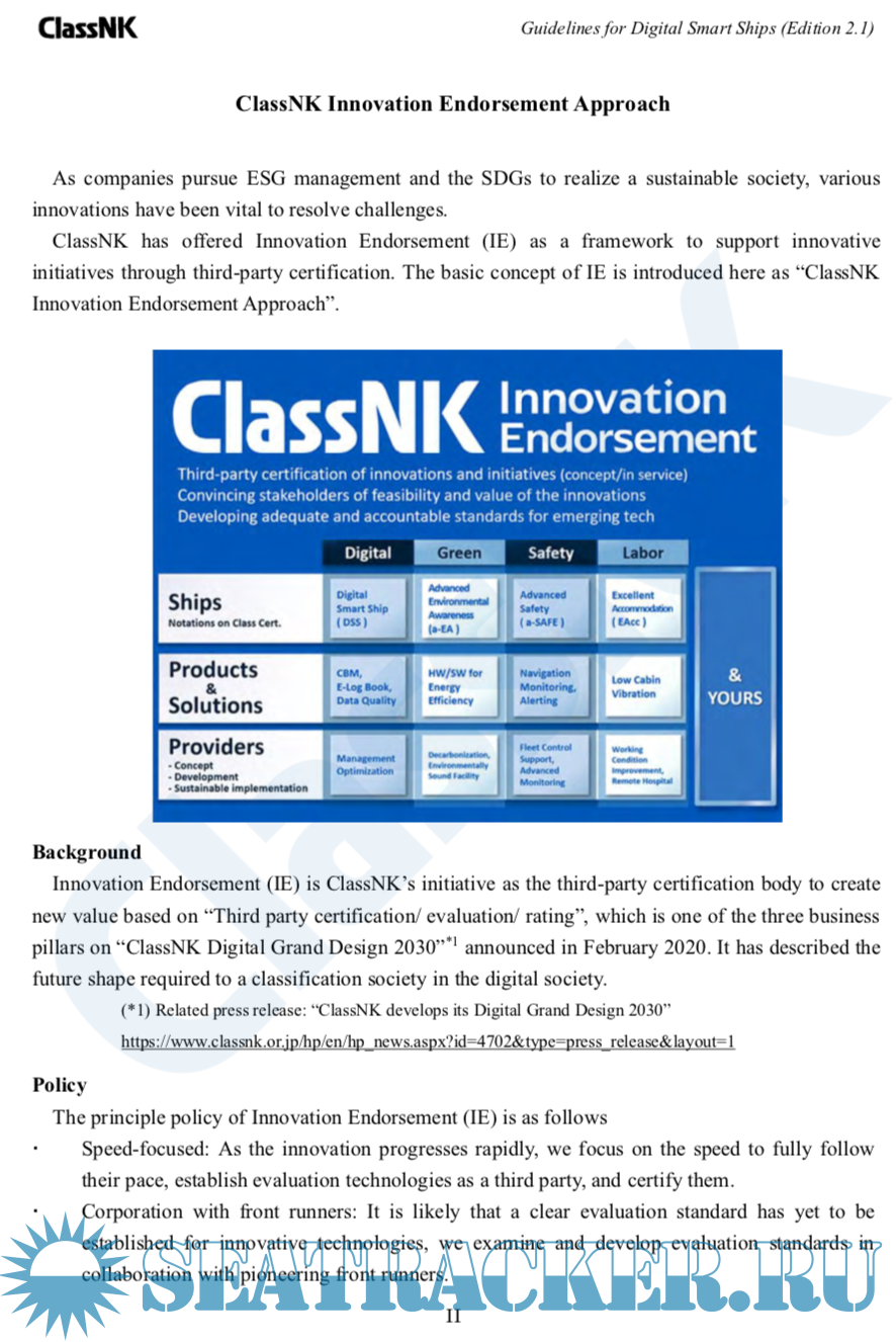 Year: 2021 Language: english Author: ClassNK Genre: Guide Publisher: ClassNk Edition: 2.1 Format: PDF Quality: eBook Pages count: 20 Description: The utilisation of Big Data is an issue currently being tackled worldwide not only by the maritime industry but by all industries. As part of its efforts, the maritime industry has already begun sharing and utilising data transferred from ships to shore-based facilities, which in turn has aided in the development of many innovative technologies. By proactively providing certification services for these innovations and promoting their spread and development, ClassNK strives to support the preservation of the marine environment, further improve safety at sea, and support the sustainable development referred to in the SDGs. Therefore, the “Innovation Endorsement” certification service which targets innovative digital technology is being launched in line with this policy. For ships applying digital technologies such as various types of monitoring and autonomous navigation (hereinafter referred to as “digital smart ships”), ClassNK decided to publish its Guidelines for Digital Smart Ships which specifies the relevant class notation that may be affixed to the classification characters of ships provided with smart systems (i.e. systems utilising digital technologies) that are in accordance with existing ClassNK Rules and Guidance. In addition, for ships provided with smart systems utilising innovative technologies not yet covered in this Guidelines, details are also specified for relevant class notation which may be affixed to classification characters of such ships in accordance with the types of smart systems they are using. ClassNK hopes that this Guidelines will be a positive contribution to current efforts being undertaken worldwide by the maritime industry not only for improving current ship operations but also for furthering the development of innovative technologies.