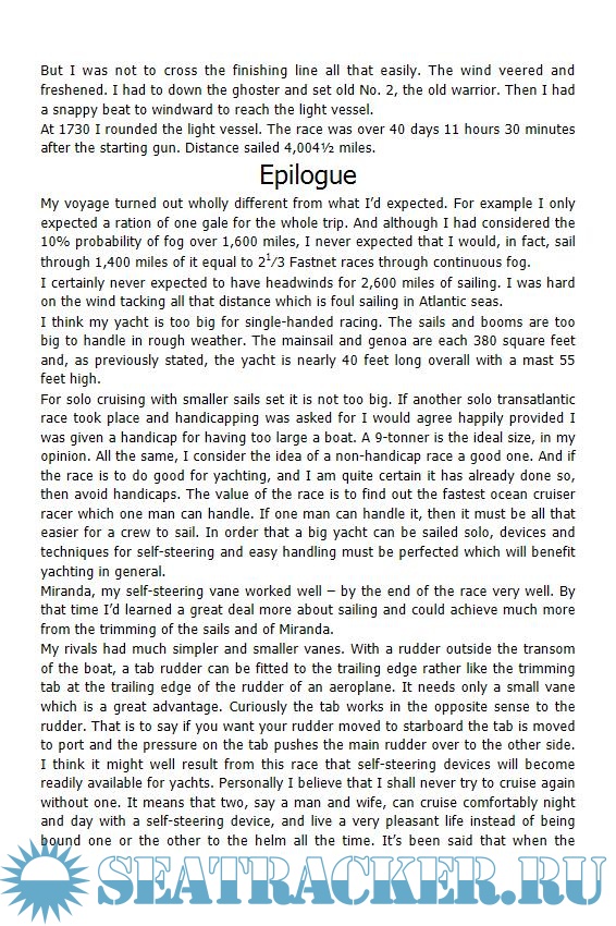 Year: 2012 Language: english Author: Chichester F. Genre: History Publisher: Bello ISBN: 1447234030 Format: EPUB Quality: eBook Pages count: 133 Description: A brave man in a small boat alone on a big sea. Vintage Chichester, written after the 1960 Singlehanded Transatlantic Race, before Sir Francis made his epic, solo voyage around the world.Chichester was a courageous explorer and gifted navigator. In this book he shares his fears and moments of exhilaration on the Atlantic. The result is both a practical tale about Gipsy Moth III's sailing victory, and a day-by-day sharing of adventure by her skipper. Additional info: About the Author Aviator and sailor Sir Francis Chichester is best known for being the first and fastest person to sail around the globe single-handedly in The Gipsy Moth IV. Following this achievement he wrote several books and made films about his sailing experiences. Born in Devon and educated at Marlborough College, Chichester emigrated to New Zealand at the age of 18 and spent ten years in forestry, mining and property development. On his return to England he learned to fly, and in the original Gipsy Moth seaplane he became the first person to complete an East-West solo flight across the Tasman Sea, for which he was awarded the inaugural Amy Johnson Memorial Trophy. Chichester wrote many popular books on his air adventures, and during WWII he wrote the manual that single-man fighter pilots used to navigate across Europe. In 1964 Chichester published his autobiography, the bestselling The Lonely Sea and the Sky, and was knighted three years later for 'individual achievement and sustained endeavour in the navigation and seamanship of small craft'. Chichester used his navigation experience to create a successful map-making company, Francis Chichester Ltd, which today still publishes pocket guides and maps which are sold throughout the world.