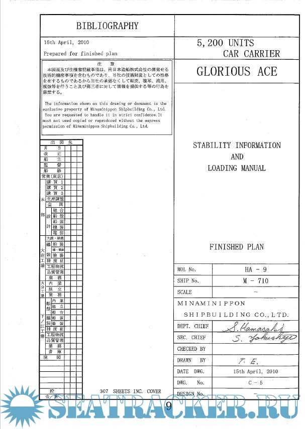 Description: Stability information and loading manual for PCC (car carrier) Glorious Ace, built in 2010 and being managed by MOL.
