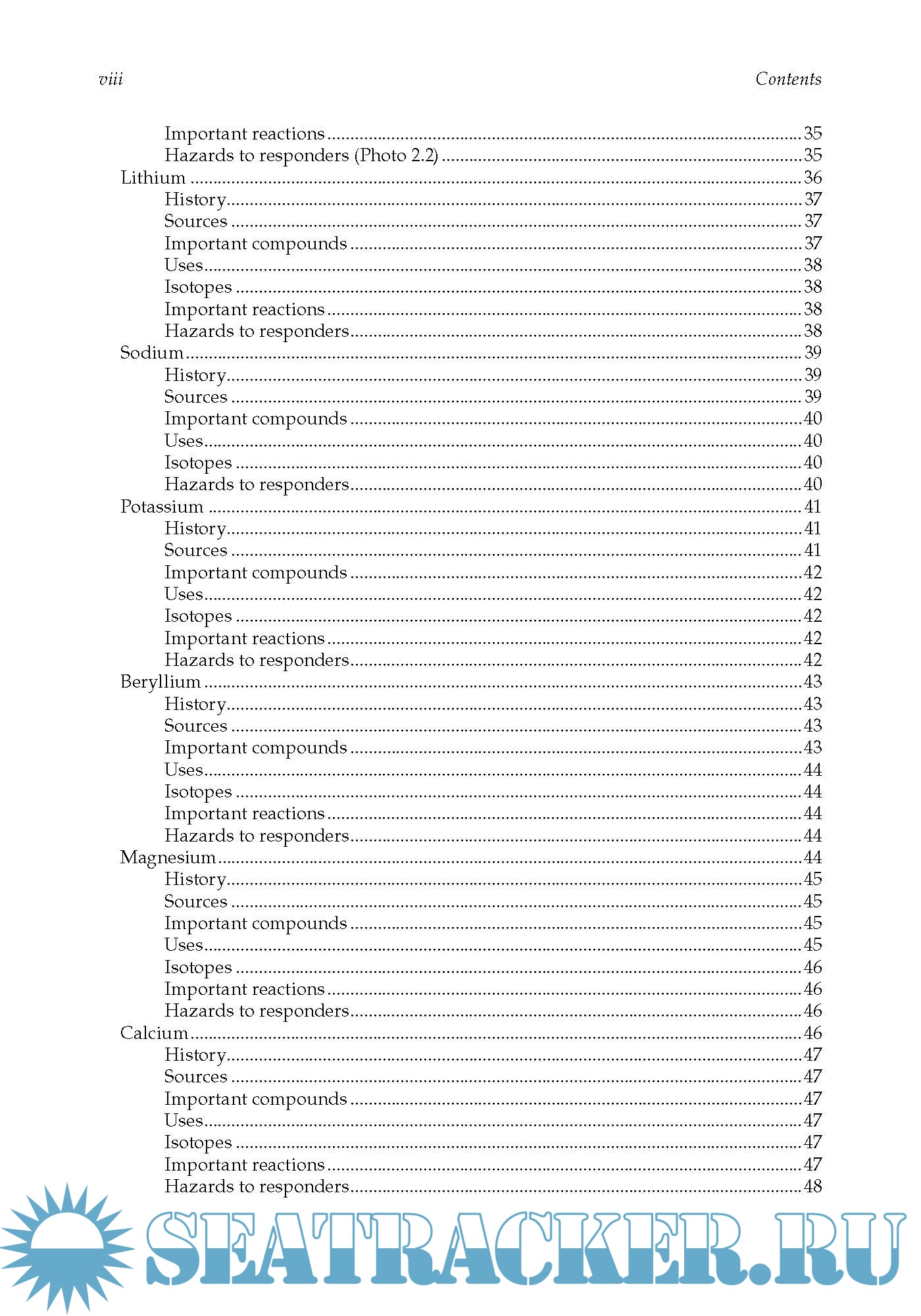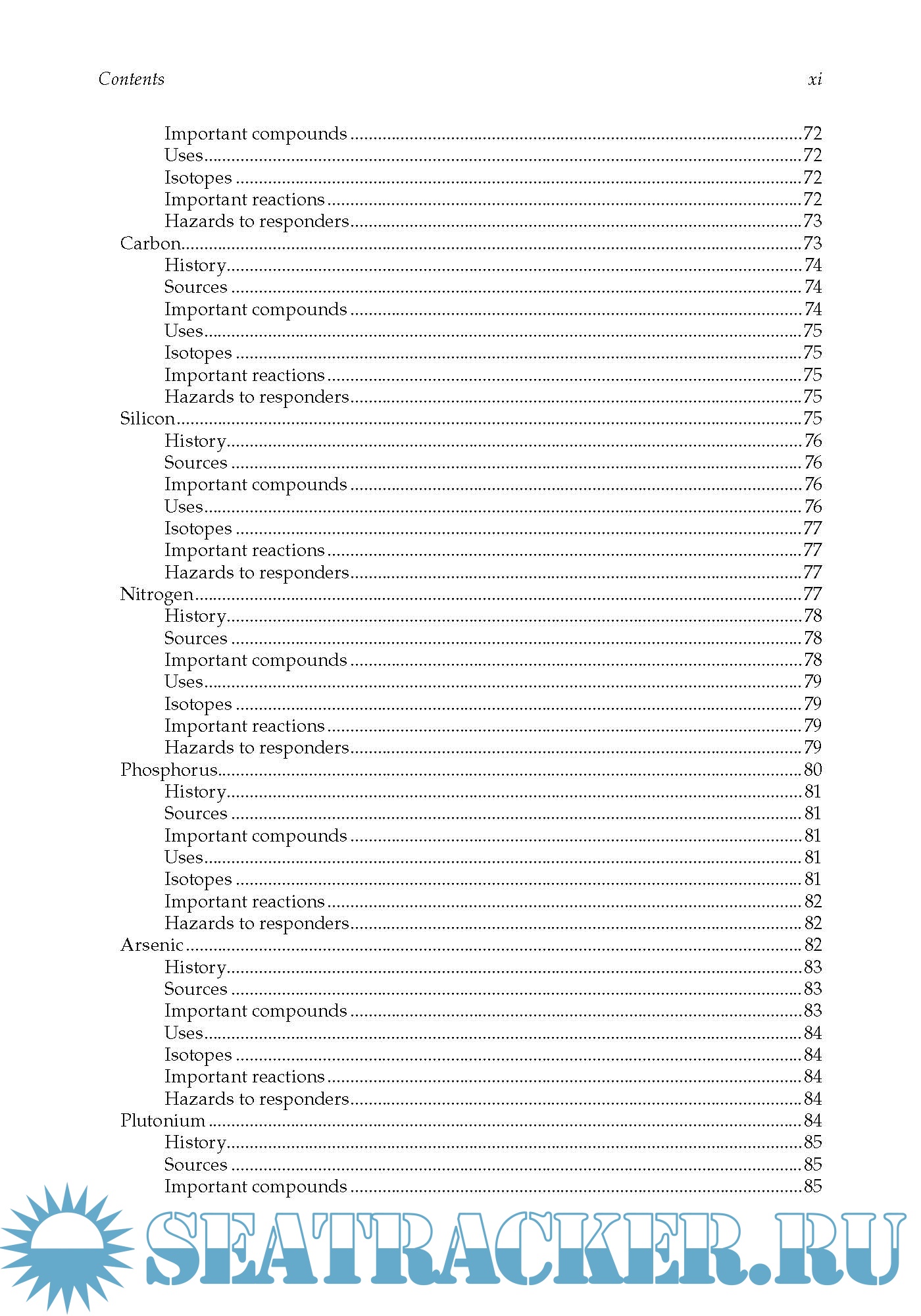 The chapters are organized by the nine U.S. Department of Transportation's hazard classes. Almost every hazardous material presents more than one hazard; the DOT’s placarding and labelling system only identifies the most severe hazards. Therefore, the book provides additional information about hidden hazards for each hazard class. It discusses individual chemicals, their hazards and their physical and chemical characteristics, both as distinct chemicals and within chemical families.