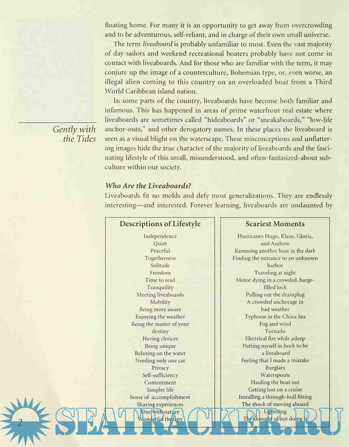 A growing number of Americans are living out a fantasy by living aboard boats. Modern boat technology, hectic life in the i:ity, the price of waterfront property, and more free time have combined to make living aboard a safe, practical, and immensely enjoyable lifestyle. Many migrate seasonally, searching for the perfect summer, while others stay put and enjoy the serenity of the waterfront, where life flows gently with the tides.