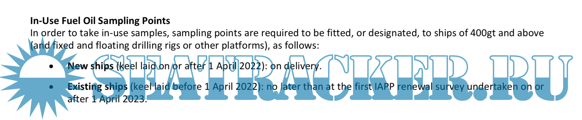 • Ships to have designated sampling points for taking representative samples of fuel oil in use, i.e. ‘In-use samples’ (regs. 14.10 to .13)