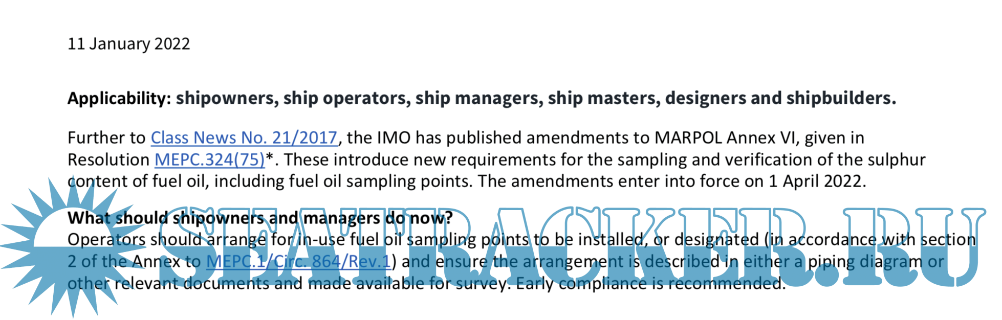 Year: 2022 Language: english Author: IMO Genre: Convention (rules) Publisher: Lloyd's Edition: 2022 Format: PDF Quality: eBook Pages count: 3 Description: Background Key amendments in MEPC.324(75) include the following requirements: • Three types of fuel oil samples now defined in MARPOL – ‘In-use sample’, ‘Onboard sample’ and ‘MARPOL delivered sample’ – used to check for compliance with sulphur limits • Ships to have designated sampling points for taking representative samples of fuel oil in use, i.e. ‘In-use samples’ (regs. 14.10 to .13) • New procedures for in-use and onboard fuel oil sampling (reg. 14.8 and .9) • Procedures for verification/analysis of in-use samples and onboard samples (Appendix VI, Part 2) • Amended procedures for verification/analysis of MARPOL delivered samples (Appendix VI, Part 1) Fuel oil samples The new amendments define three types of fuel oil samples: • In-use sample: a sample of fuel oil in use on a ship (i.e. typically taken downstream of the in-use fuel oil service tank and close to the fuel oil combustion machinery)
