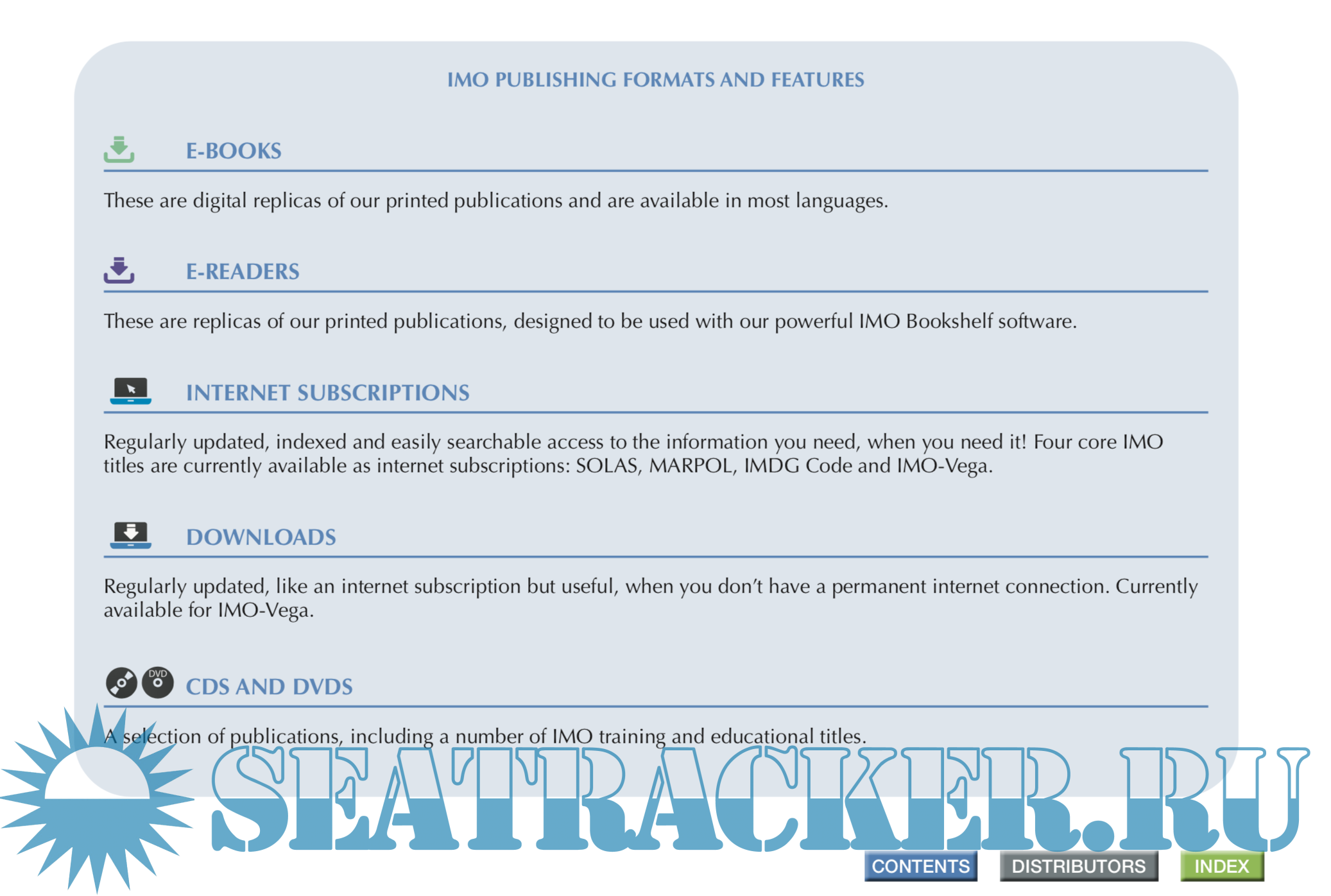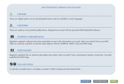 Description: IMO Publishing’s activities provide the world’s maritime community with numerous texts (conventions, codes, regulations, recommendations, guidelines, etc.) prepared by the Organization. There are over 200 titles available in English. Many are translated into Arabic, Chinese, French, Russian and Spanish. IMO Publishing also produces digital products, namely e-books, e-readers, electronic downloads, CDs and internet subscriptions. The dissemination of this information, including attendance at maritime exhibitions worldwide and regular e-newsletters to interested parties, plays an important role in promoting shipping as a safe, secure, efficient and environmentally-friendly method of transporting goods around the globe. Please address enquiries to: