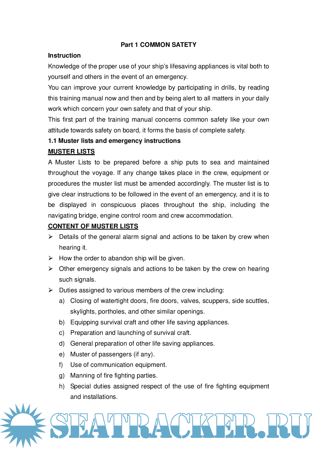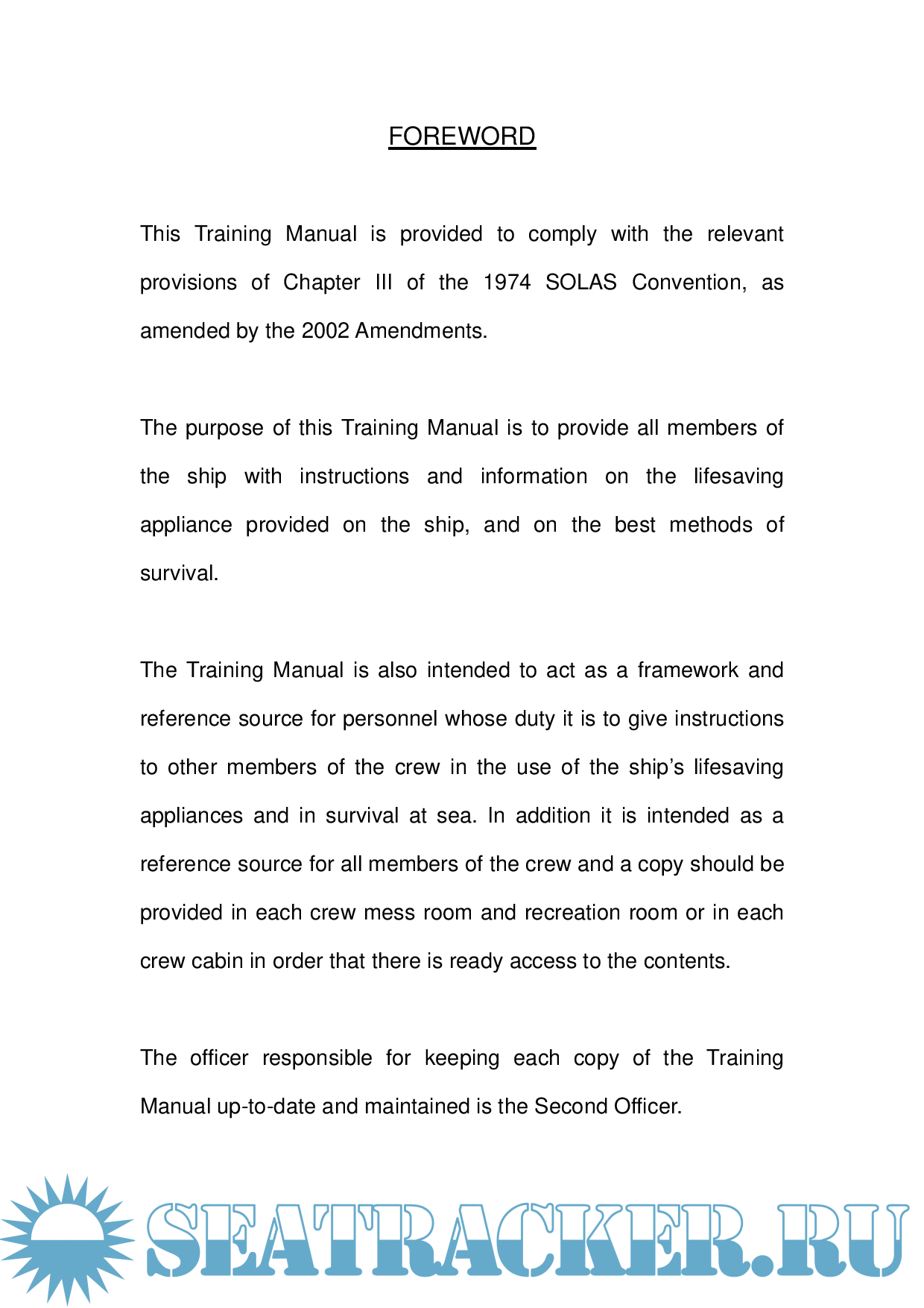 The Training Manual is also intended to act as a framework and reference source for personnel whose duty it is to give instructions to other members of the crew in the use of the ship’s lifesaving appliances and in survival at sea. In addition it is intended as a reference source for all members of the crew and a copy should be provided in each crew mess room and recreation room or in each crew cabin in order that there is ready access to the contents.
