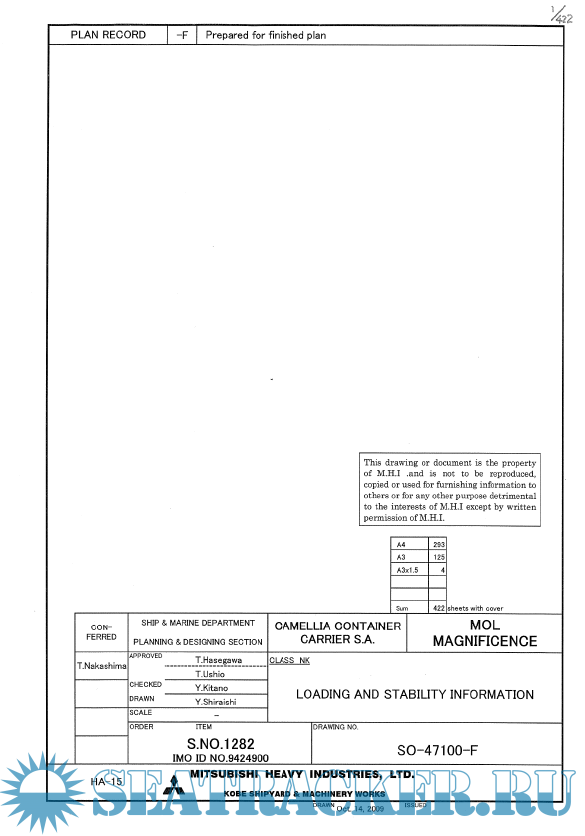 Loading and stability information. Containership MOL Magnificence, 6724 TEU - Mitsubishi Heavy Industries Ltd. Kobe Shipyard and Machinery Works