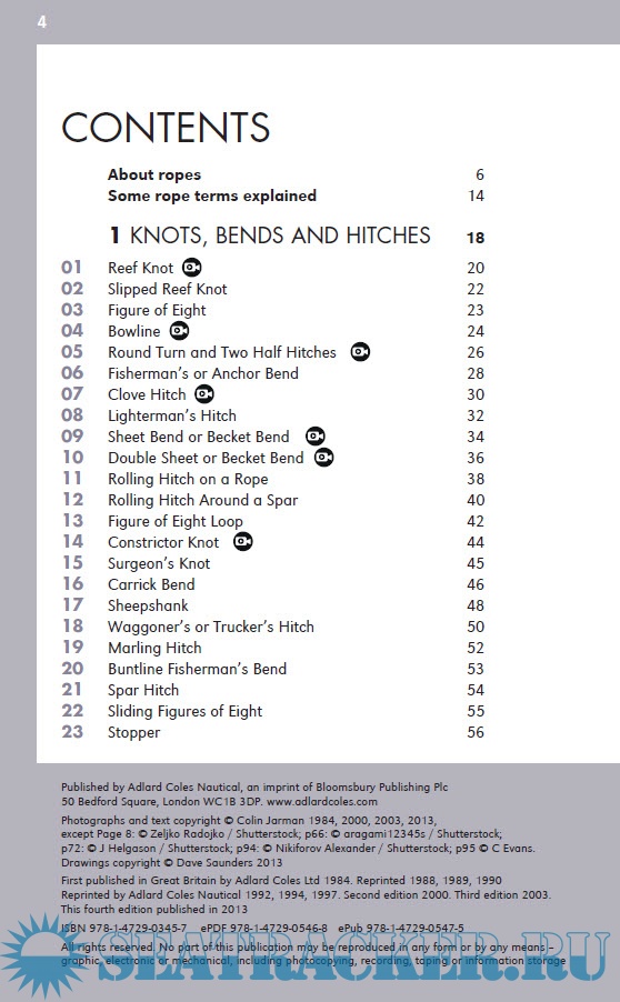 Year: 2013 Language: english Author: Colin Jarman Publisher: Adlard Coles Nautical Edition: 4th ISBN: 978-1-4729-0345-7 Format: PDF Quality: eBook Pages count: 97 Description: Knots in Use is a bestseller amongst knotting books. A handy pocket size, it covers all the most useful and practical knots, bends, hitches, whippings and splices used every day by anyone going to sea - a unique benefit. It shows at a glance both how to tie the knot, bend or hitch, and how to use it most effectively. As an added feature this new edition now includes QR codes that link to explanatory videos - a real boon for novices and experts alike. Colin Jarman's straightforward text and excellent colour photographs coupled with online video demonstrations make this a very user-friendly book - ideal for skippers, crew and the many evening class students who have relied on it over the years. Knots in Use is the must-have guide for anyone going to sea. Additional info: Scan QR Code inside for step by step videos.