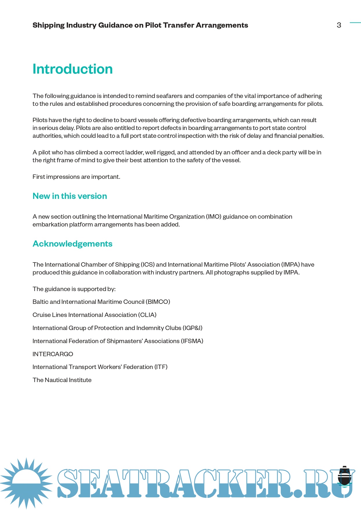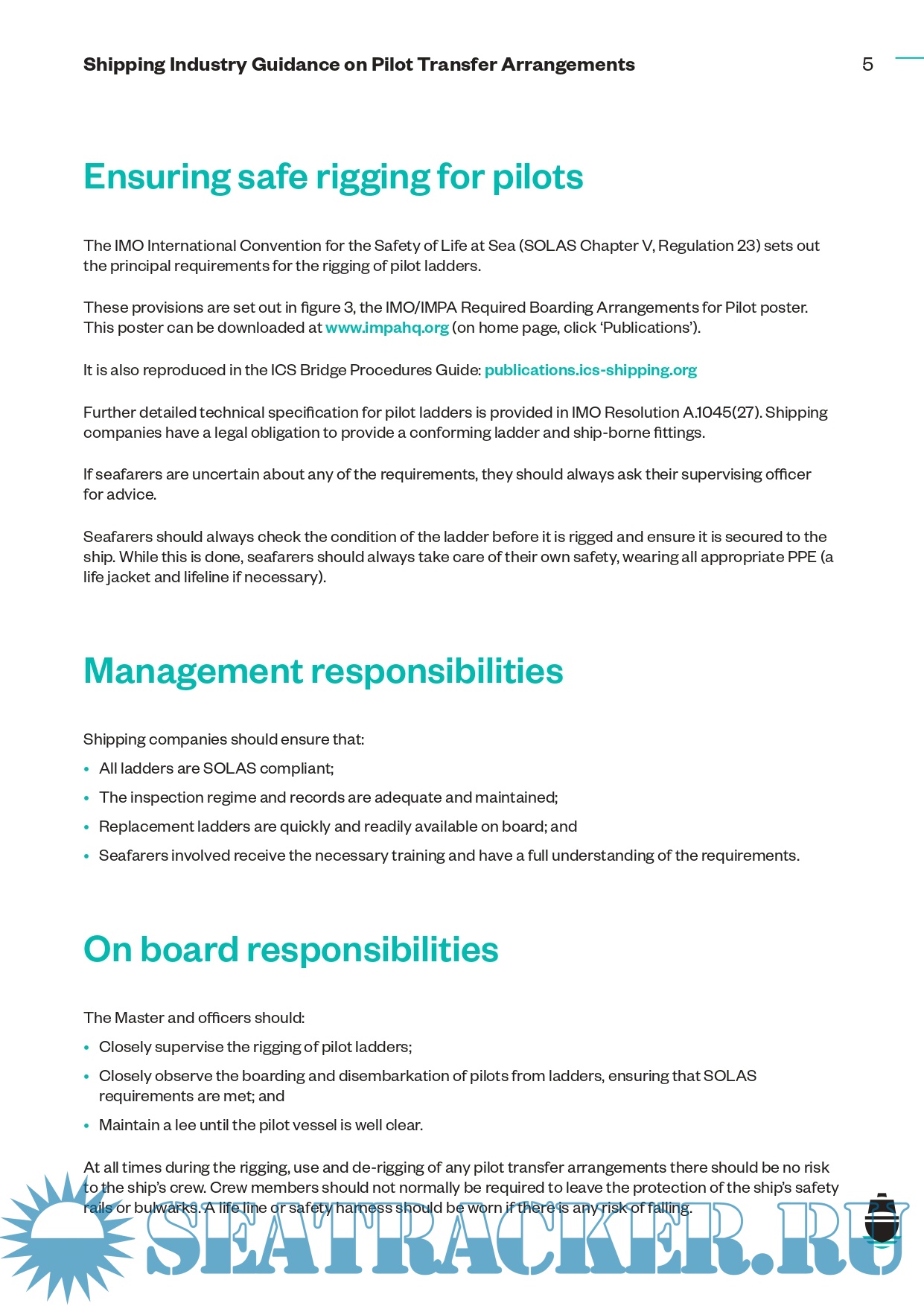Year: 2022 Language: english Author: INTERNATIONAL CHAMBER OF SHIPPING (ICS) Genre: Руководство Format: PDF Quality: eBook Number of pages: 6 Description: Pilots have the right to decline to board vessels offering defective boarding arrangements, which can result in serious delay. Pilots are also entitled to report defects in boarding arrangements to port state control authorities, which could lead to a full port state control inspection with the risk of delay and financial penalties. A pilot who has climbed a correct ladder, well rigged, and attended by an officer and a deck party will be in the right frame of mind to give their best attention to the safety of the vessel.