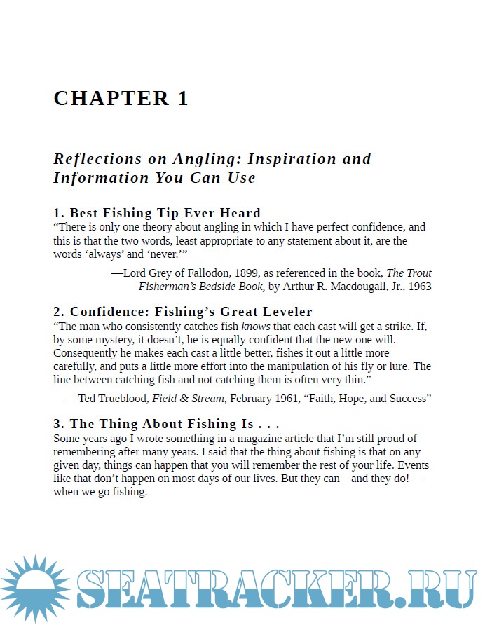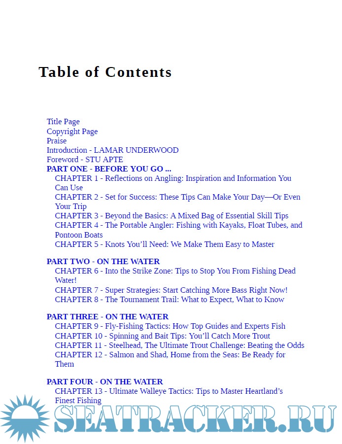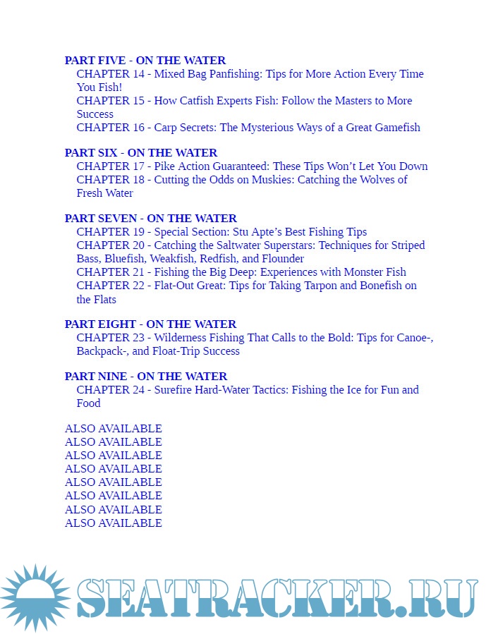 Year: 2010 Language: english Author: Lamar Underwood Publisher: Skyhorse Publishing ISBN: 9781602396890 Format: PDF Quality: eBook Pages count: 401 Description: Ten percent of all anglers catch 90 percent of the fish taken. It’s really true, and shows that as much as it is enjoyable, fishing can be frustrating when it comes to results. 1001 Fishing Tips is the book that will help any angler crack into fishing’s elite successful 10 percent, the group that catches more fish and has more fun every time they get out fishing. Revealed here in quick-read, info-laden nuggets of angling wisdom are the secrets and techniques that make the difference between success and failure. Fishing isn’t just luck: it’s know-how and timing, presenting the right bait and lure at the right places at the right time. Coverage focuses on the most popular freshwater game fish—including trout, bass, crappie, bluegills, walleye, catfish, salmon and pike—and saltwater