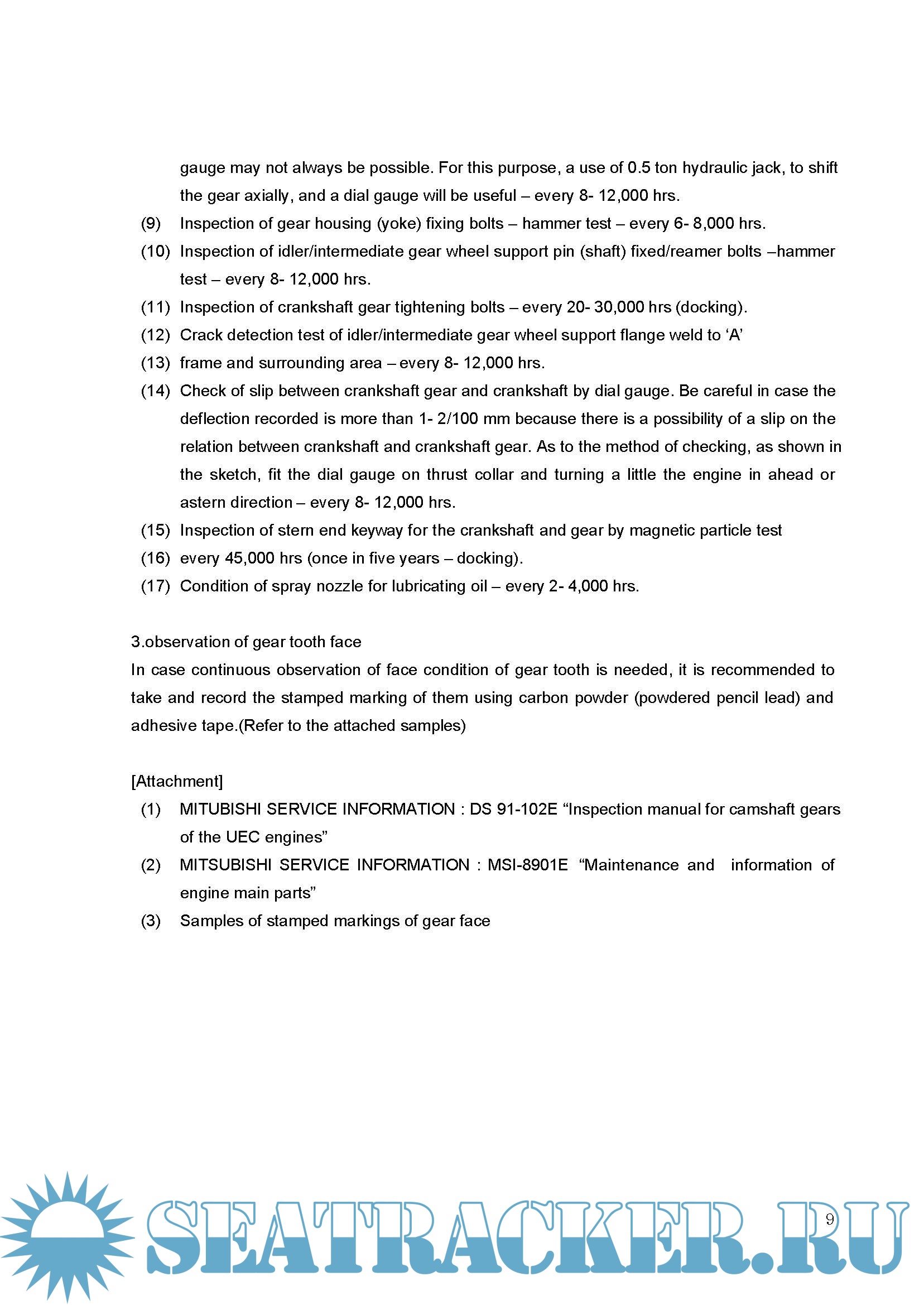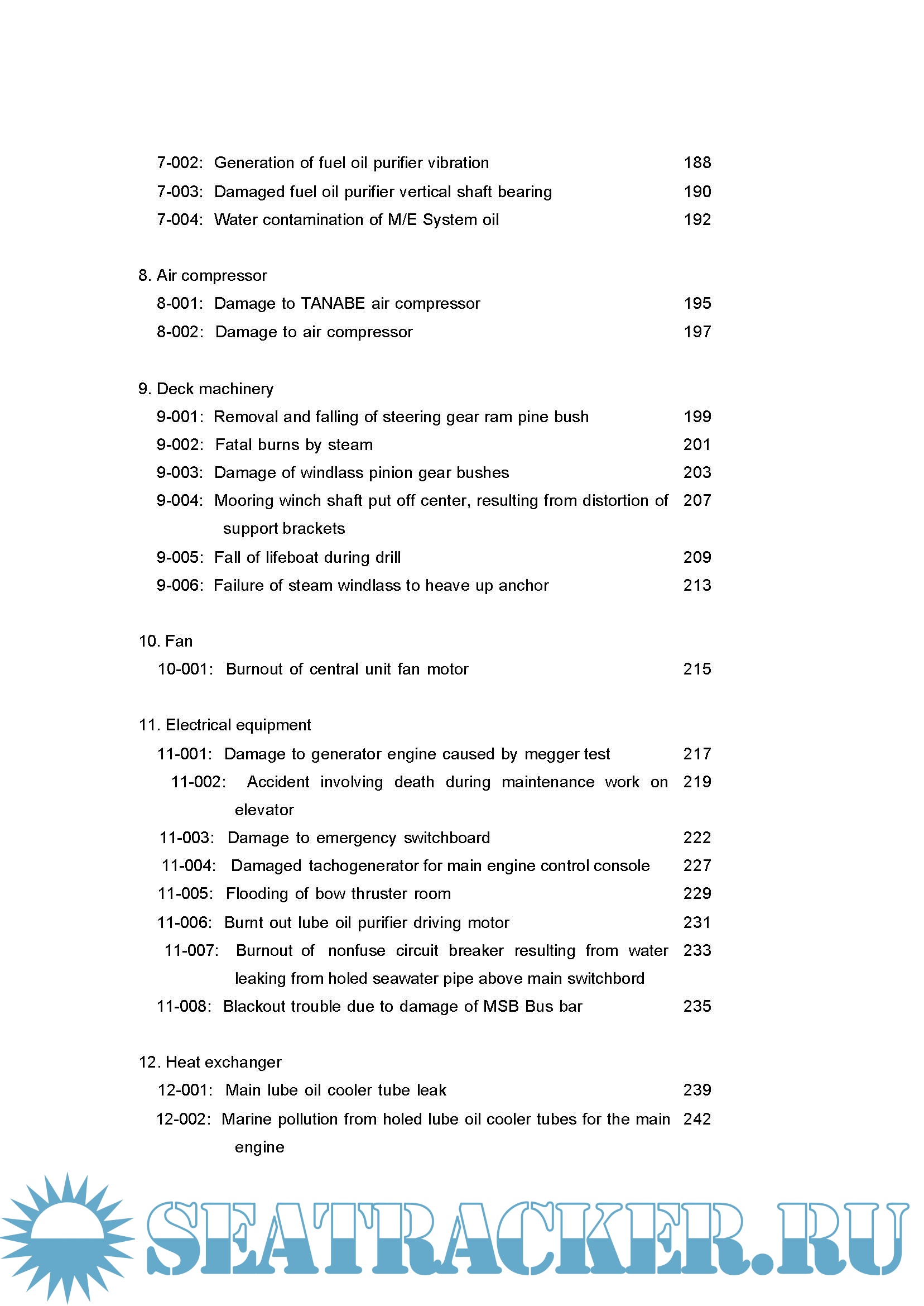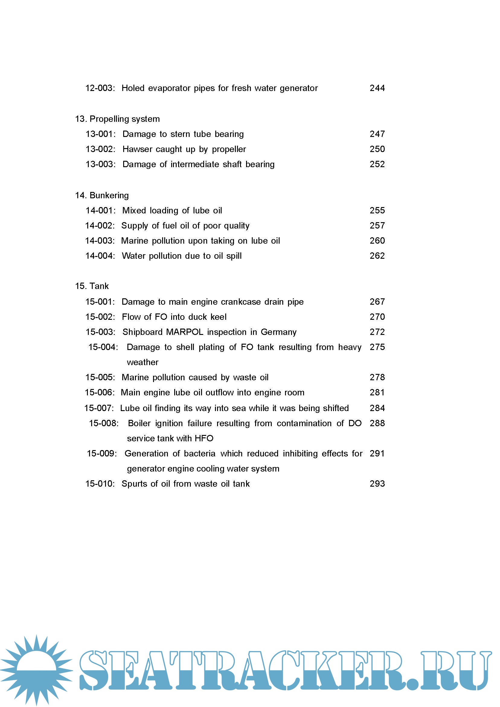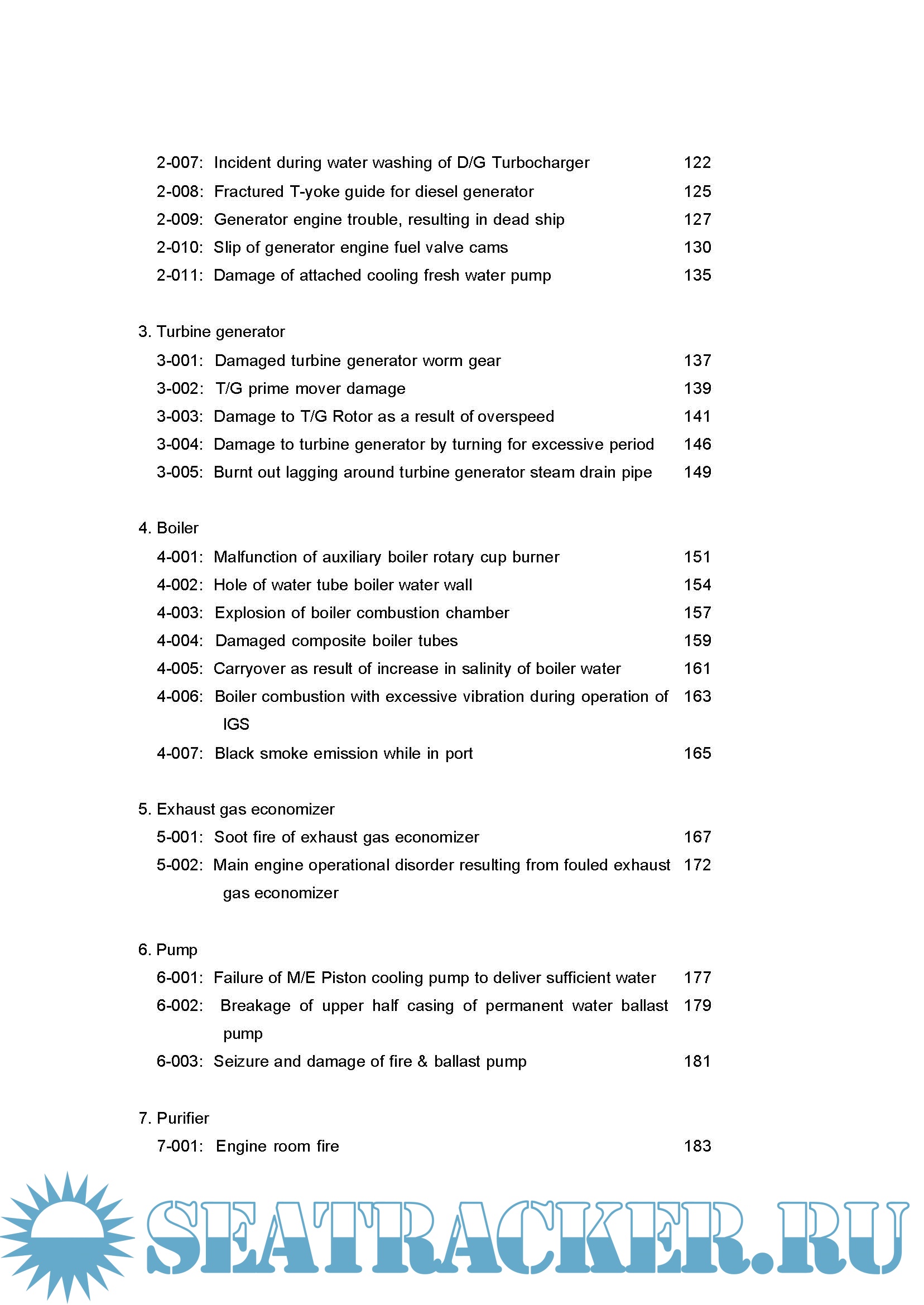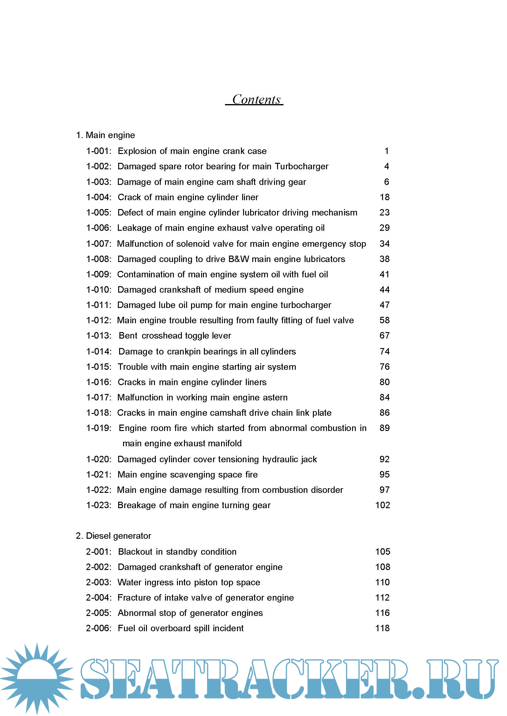 Year: 2001 Language: english Author: Mitsui O.S.K. Lines Publisher: Mitsui O.S.K. Lines Format: PDF Quality: eBook Pages count: 322 Description: We, in the group of Mitsui O.S.K. Lines, currently operate about 500 vessels. According to the statistics of vessel accidents in 2000 contained in data base for MOL-operated vessels (refer to the attached charts), the incidence of accidents (breakdowns which actually affected ships’ schedules or those which had such a potential) was as high as 0.94 case per vessel. Ever since 1996 when statistics were first compiled, about 40% of the accidents which occurred with vessels under our operation, are related to ships’ machinery. It is said that about 80% of accidents with ships are attributed to human error but this statistical figure is not directly applicable to engine-related damage. It is because the engine of a ship is a “man-machine system” operated with man and machinery complementing each other and, as a result, accidents of machinery always involve human beings. The causes of engine accidents are varied, but statistics of engine damage show that structural defects, and problems with design or workmanship, largely account for such accidents. We do not encounter, with a high frequency, cases where the mishandling of equipment and instruments on the part of crew members directly contributed to accidents. There is also a tendency for similar accidents to occur on board many vessels with similar specifications. Essentially, even if it is possible to reduce the number of failures of equipment and instruments or human errors, it is impossible to bring it to “zero”. It is, therefore, important that, in order to prevent accidents, a breakdown or failure, if incurred, be averted from developing into a serious event. This means that crew members are required to recognize abnormal engine conditions as such as early as possible and stop or arrest, in the process, the flow toward degradation of the failure to a seriousaccident. In order to realize that various phenomena (e.g., temperature, sound, pressure, leak, discoloration) which appear in equipment and instruments are signs which may precede subsequent accidents, experience as a professional is naturally required. However, in reality, there is a limit to the experience one engineer can have in the performance of his duties on board vessels. It is, therefore, important to sufficiently analyze accidents which have occurred on board other vessels and utilize such analyses as lessons to prevent accidents of similar kinds. The Marine Engineering Group, Marine Division, shoulders the role to make continued efforts to investigate into causes of machinery damage and, on the basis of such investigations, determine guidelines for the operation of engines on board vessels under our operation. This time, we have put a large number of engine trouble cases in perspective in terms of the cause, countermeasure and lesson, to compile this set of “Engine Accident Cases”. We request you to take full advantage of this material for training those who embark vessels under MOL’s operation as engineers, thereby to prevent the occurrence of engine-related accidents.