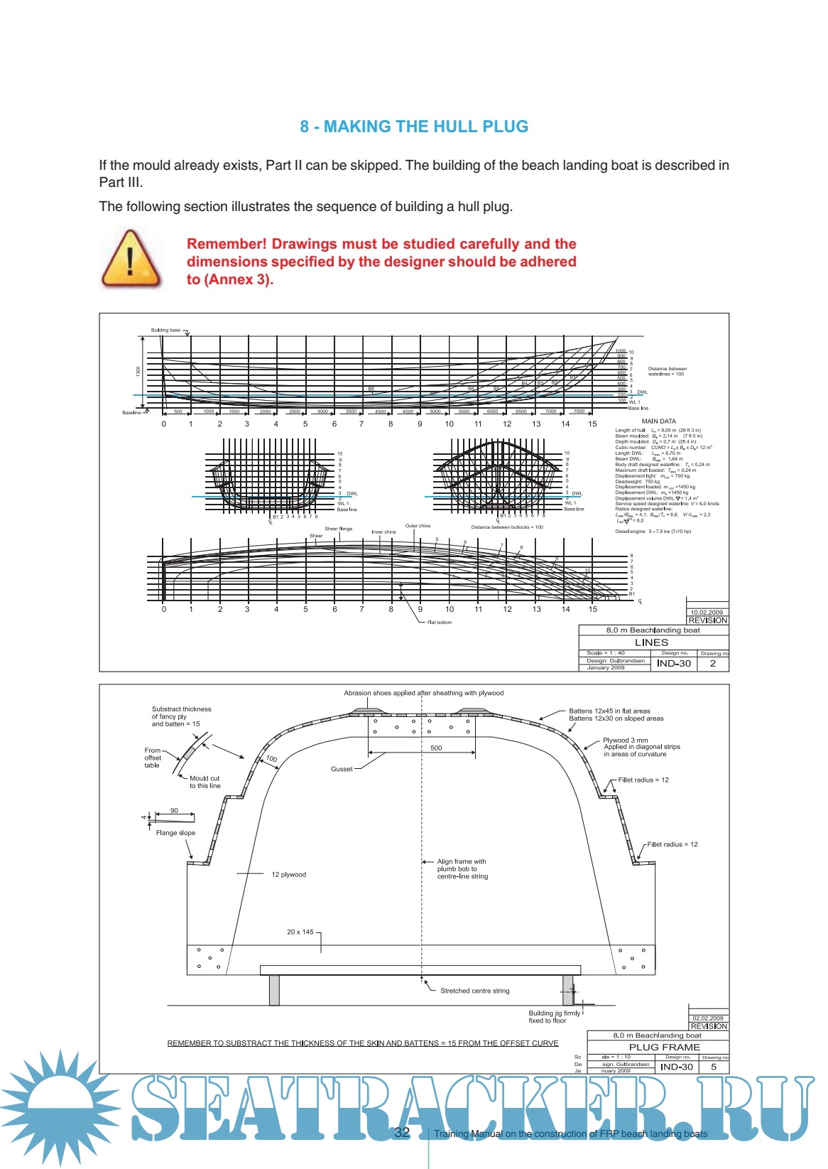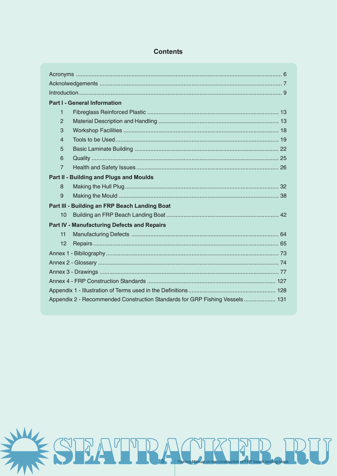 Year: 2010 Language: english Author: Anmarkrud T. Genre: Manual Publisher: FAO/SIDA/IMO/BOBP-IGO Format: PDF Quality: Scanned pages Pages count: 152 Description: This manual on construction of fibreglass reinforced plastic (FRP) beach landing boats has been prepared primarily to assist small boatyards in Tamil Nadu, India that build beach landing fishing boats, but may also be used as a guide for making good quality FRP boats as well as for FRP training in the region. The manual should be seen as a supplement to FRP boatbuilding manuals available in the Food and Agriculture Organization of the United Nations (FAO) and other international publ ications. It assumes prior knowledge of FRP hand lay-up processes and terms generally used in the industry. Recommendations on working conditions, materials and quality control are based on tropical ambient conditions and the type of boatyards likely to build such boats. Part I of the manual contains general information on FRP materials, handling and working conditions. Part II describes the building of a hull plug and a mould and Part III describes the building of a beach landing boat. Finally, Part IV contains information on manufacturing defects and repairs. The manual has four annexes that provide further information related to FRP boatbuilding. Annexes 1 and 2 contain a bibliography and a glossary, respectively. All drawings for the FAO IND-30 boat design are provided in Annex 3. Finally, Annex 4 contains the draft recommended construction standards for FRP fishing vessels. These standards are a part of the FAO/ILO/IMO Safety recommendations for decked fishing vessels of less than 12 m in length and undecked fishing vessels, which are currently under development.