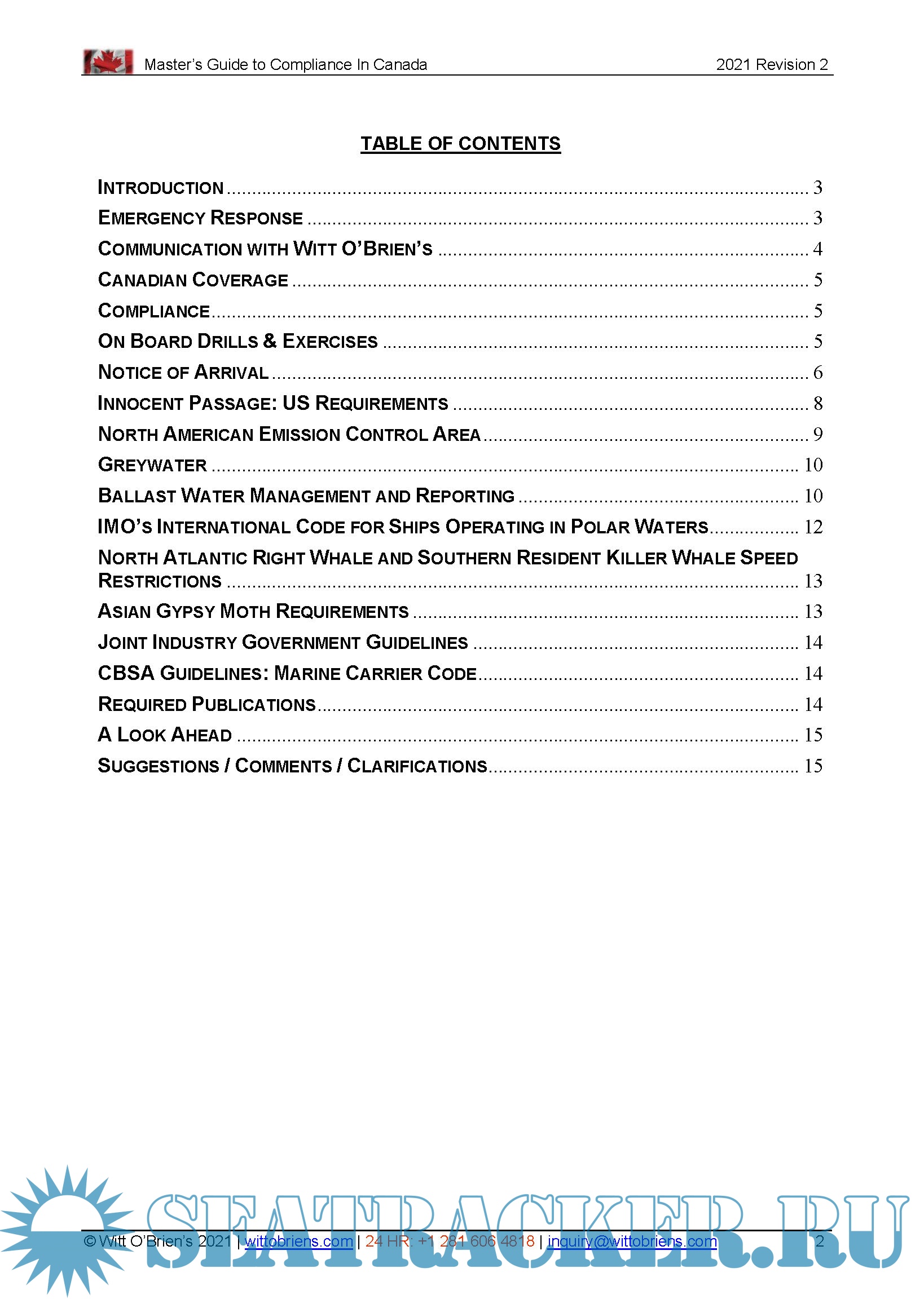 Year: 2021 Language: english Author: Witt O'Brien's Genre: Guide Format: PDF Quality: eBook Pages count: 15 Description: Revision 2 dated October 2021 of Master's Guide to Compliance in Canada This is a practical guide for Masters to assist in compliance with Canadian laws and regulations. It is not an “official” document and is not required for compliance. It is intended to provide useful direction for Masters. It does not replace any document required by law or regulation. It does not replace direction provided by the ship’s owner/manager/operator. This guide may be modified as required to be in harmony with policies of the owner/manager/operator. The Master of any vessel making a call to Canada faces several regulatory issues that are specific to Canada. This guide is intended to help the Master effectively and efficiently face these issues. Witt O’Brien’s is providing this guide to help ensure your compliance. Use of the directions in the guide will allow Witt O’Brien’s to better serve you. Information designed to save you time and effort is present in orange italics