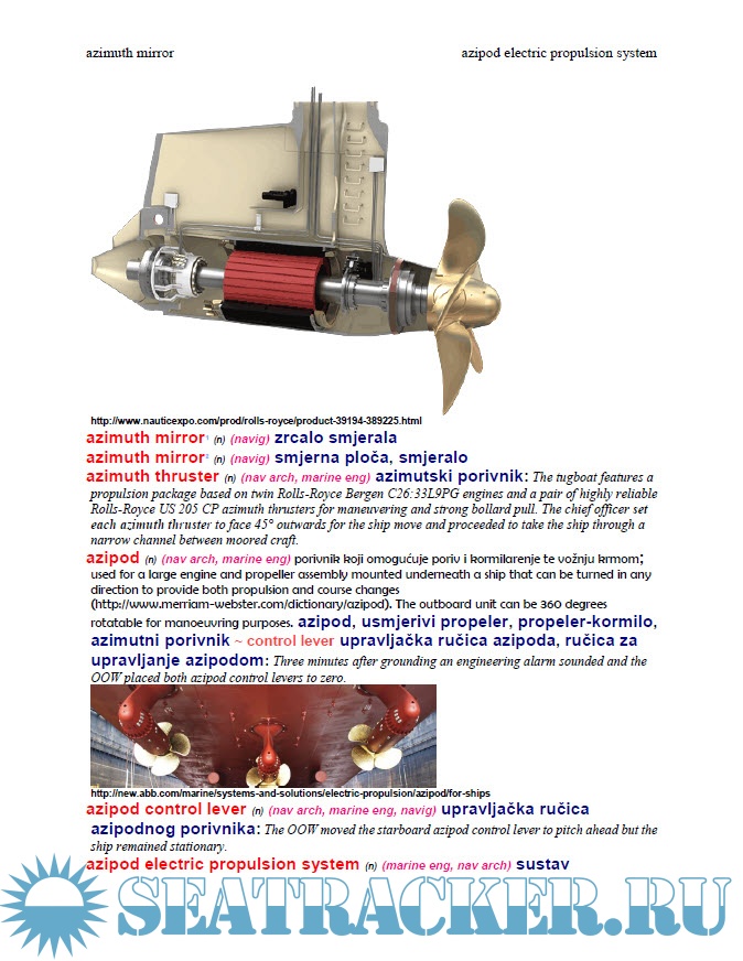 Grateful acknowledgement is made to the website sources, primarily a series of maritime glossaries and dictionaries, which are shown in italics in the definitions. Similar references are also made to web-based sources contributing or making part of usage examples. The same also holds for term illustrations which can be traced on the web. Every effort has been made to contact copyright holders and obtain permission for occasional use of their respective resources. If any have been inadvertently overlooked or mispresented the author will be pleased to make the necessary amendments at the first opportunity.