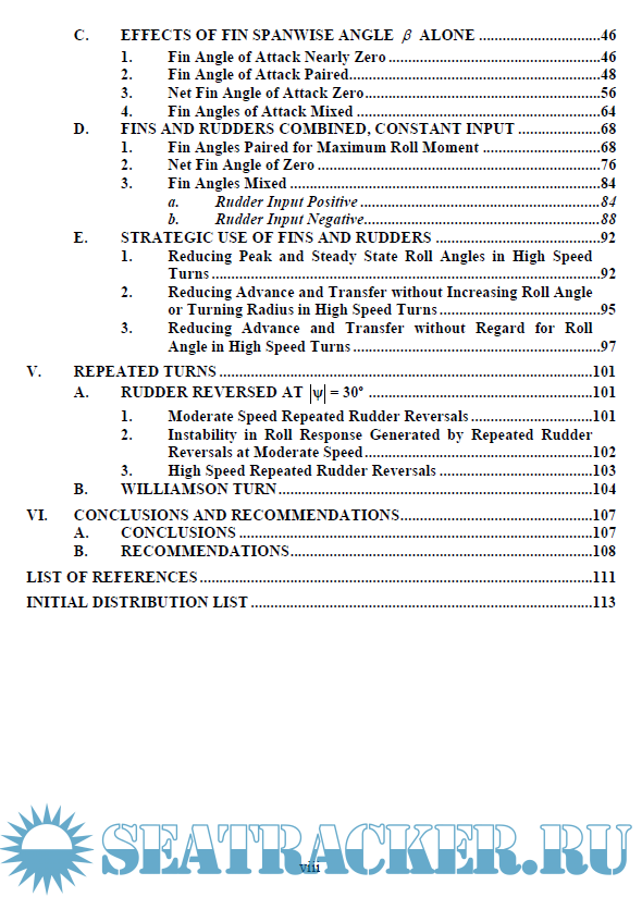 Description: Roll angle is often a limiting factor during high-speed turns and repetitive turning manoeuvres. Navy and Coast Guard surface ships are designed for high-speed operation. Sharper turns at higher speeds and repetitive high-speed turns can increase ship survivability by helping these vessels avoid incoming threats. This is particularly true if the amount and direction of roll during the turn are controlled, since the ship’s susceptibility to radar and other sensors may be diminished at certain angles. Sharper turns at higher speeds can also reduce the time it takes to reach a person in the water, improving the chances for a successful rescue. Controlled roll during repetitive sharp turns can make high-speed pursuit safer and more likely to succeed. The objective of this thesis is to study the effects of fin stabilizers on a ship’s turning performance. Fin stabilizers, commonly added to a ship design for the sole purpose of minimizing unwanted roll during ordinary operations, are shown to also favourably influence both the magnitude and direction of heel experienced during high speed and repetitive manoeuvres. The effects of fin stabilizers on other turn performance characteristics are also examined. A strategy for actively employing fins during manoeuvres is proposed.
