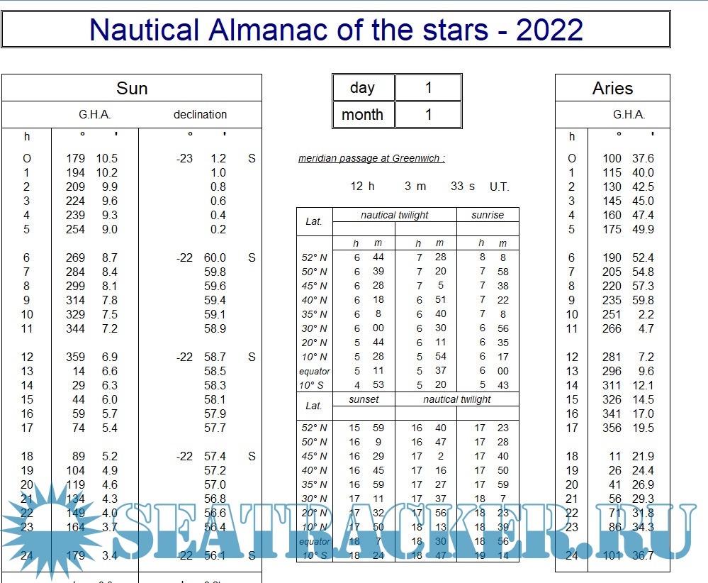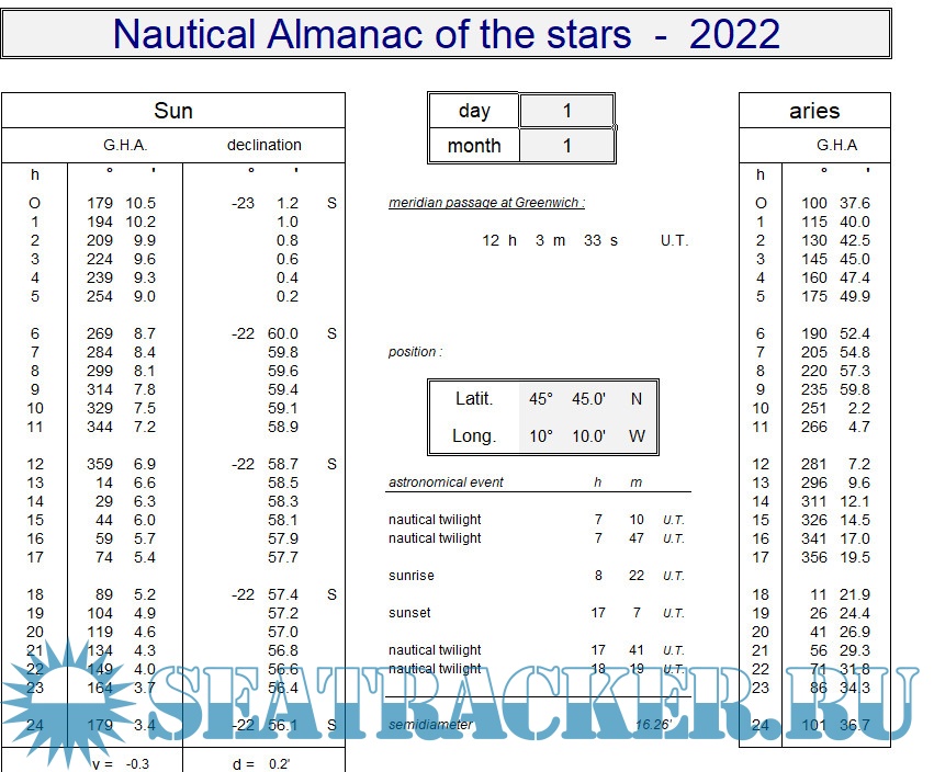 Year: 2022 Language: english Author: Capt. Roberto Iori Genre: Documentation Publisher: Capt. Roberto Iori Edition: 2022 Format: Other Quality: Unknown Pages count: 2 Description: Astronomical almanac for mariners - "excel" version By entering latitude and longitude of the estimated position excel automatically calculates the times of the astronomical events in U.T. (Greenwich Mean Time) : twilight, sunrise and sunset.