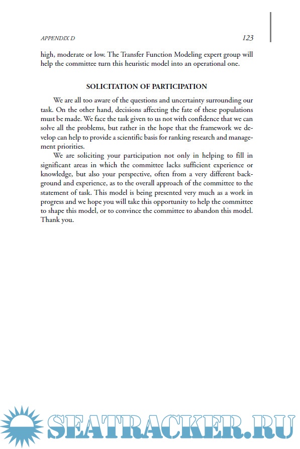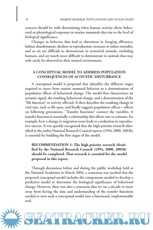 Description: Attention has been drawn to the subject of how ocean noise affects marine mammals by a series of marine mammal strandings, lawsuits, and legislative hearings, and most recently, the report from the U.S. Commission on Ocean Policy. One way to assess the impact of ocean noise is to consider whether it causes changes in animal behavior that are "biologically significant," that is, those that affect an animal's ability to grow, survive, and reproduce. This report offers a conceptual model designed to clarify which marine mammal behaviors are biologically significant for conservation purposes. The report is intended to help scientists and policymakers interpret provisions of the federal Marine Mammal Protection Act.
