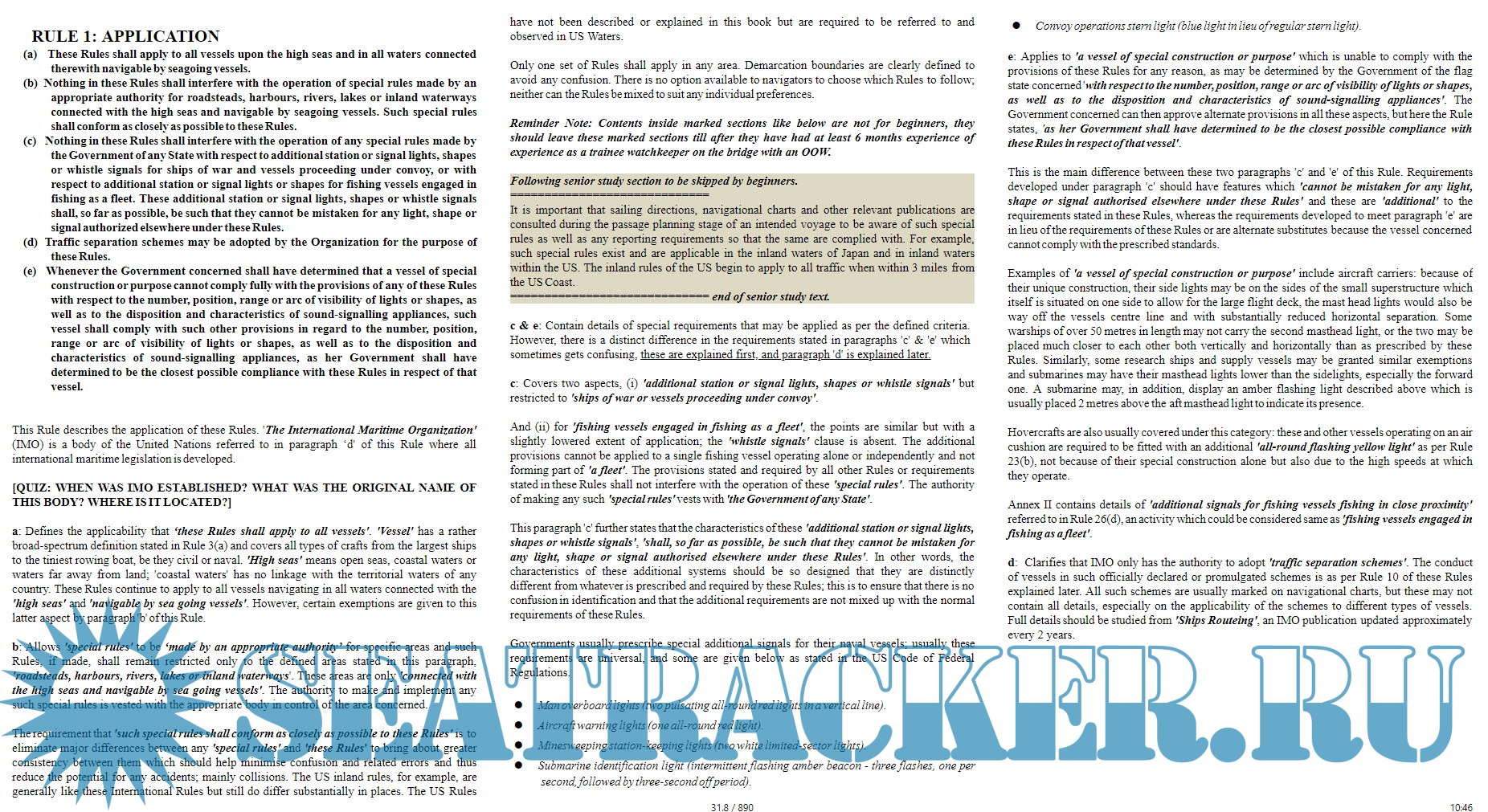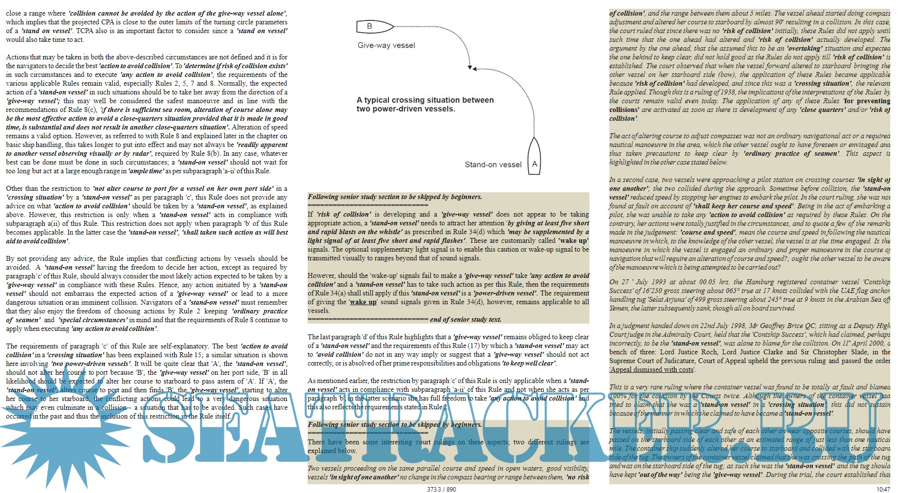 The interactive learning involves tasks, quizzes, exercises, case studies, court rulings; all amalgamated with watchkeeping requirements from STCW and SOLAS Conventions; and linked to basic ship handling principles.