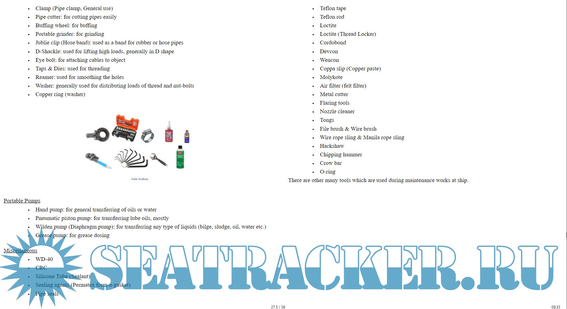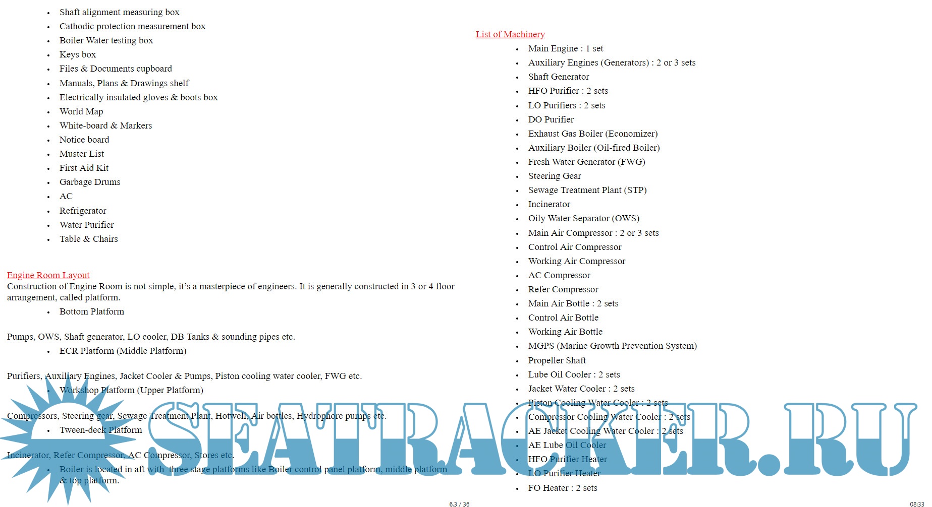 1. Things to do before joining your first ship 2. Introduction of Engine Room 3. Duties of Junior Marine Engineer 4. Watch-keeping Skill 5. Engine Room Tools for Daily Use 6. Tips for Smart Engineer 7. Engine Room Log Book 8. Interesting Information