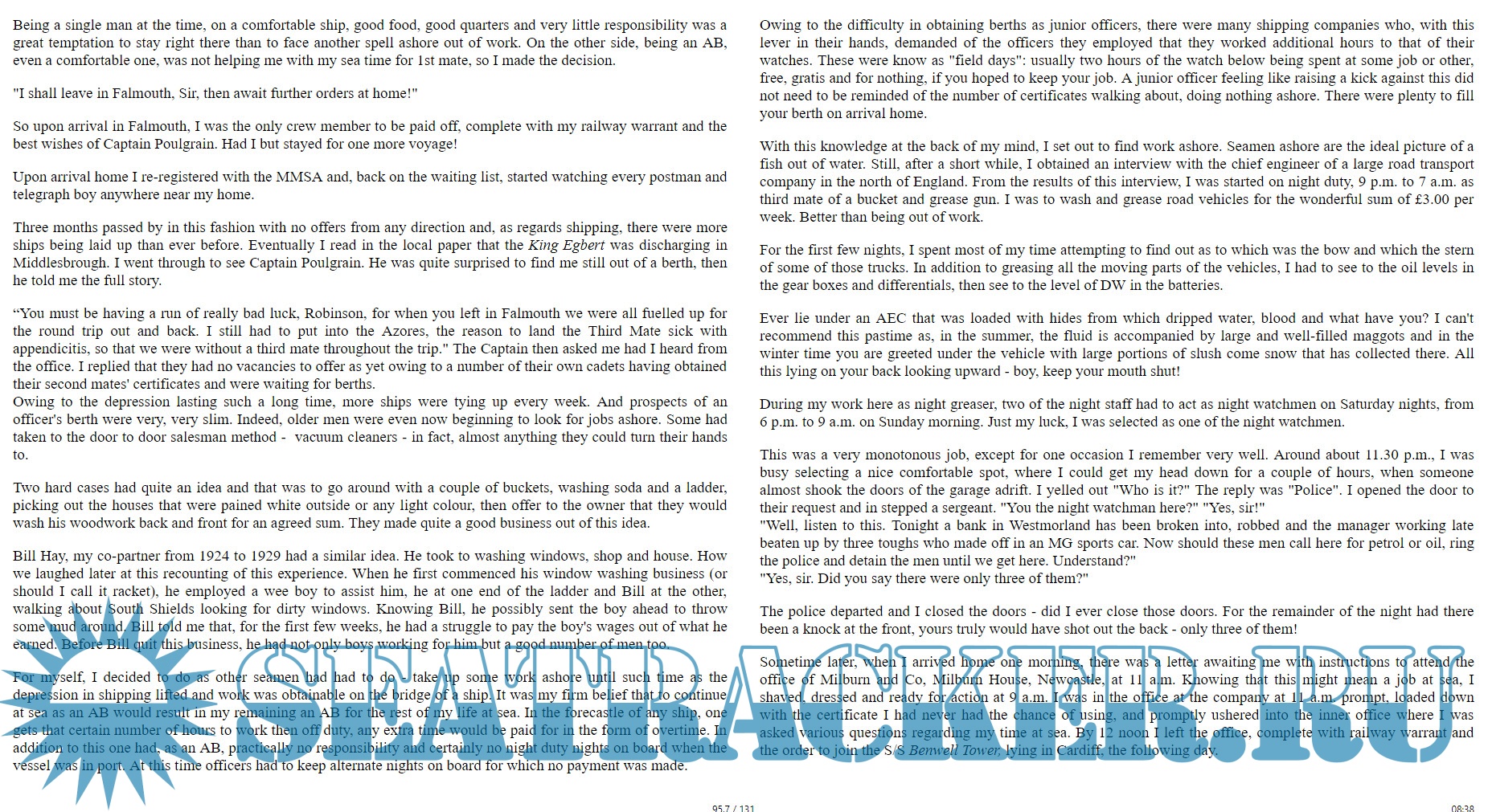 Year: 2017 Language: english Author: George W. Robinson Format: EPUB Quality: eBook Pages count: 131 Description: This is the story of a boy of 14 who joined the Merchant Navy in 1924. Life at sea was hard then, but became even worse as the interwar depression deepened. Regrettably, George doesn’t appear to have written anything of his time between 1931 and 1940, but the story resumes to describe his harrowing experiences after the sinking of the Carlton by an Italian submarine.