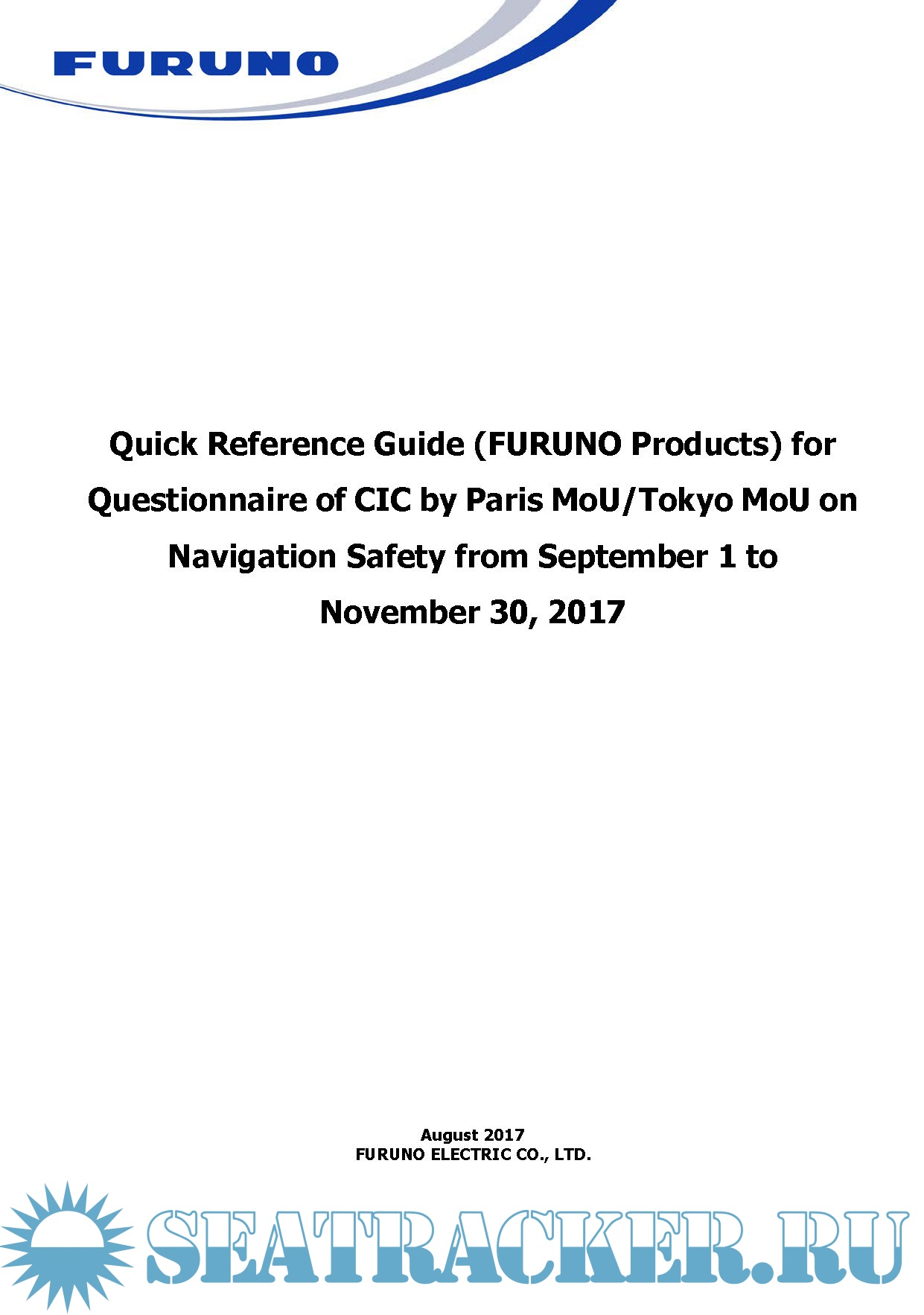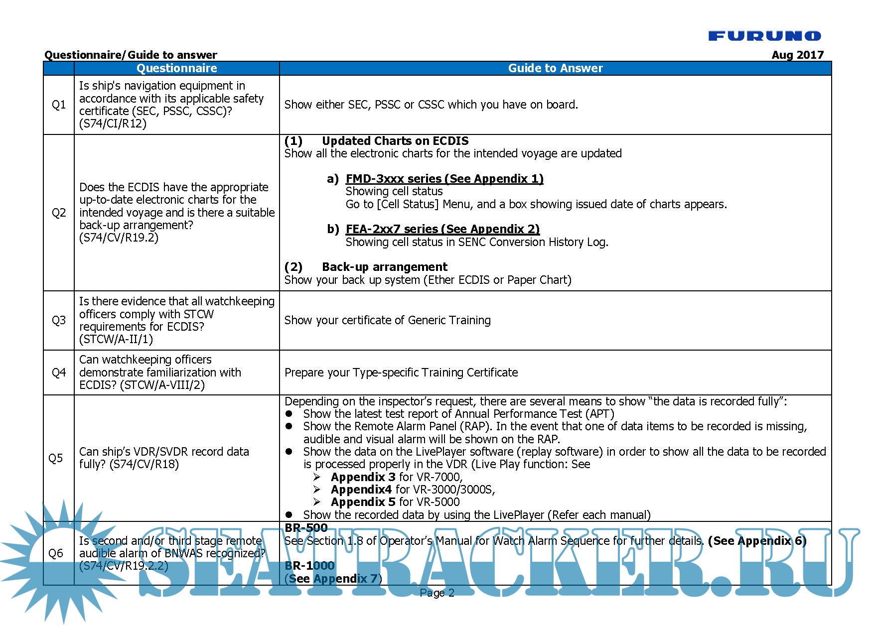 Year: 2017 Language: english Author: Furuno Genre: Guide Format: PDF Quality: eBook Pages count: 25 Description: This is just a quick reference guide for a preparation of CIC by Paris MOU and Tokyo MOU on Navigation Safety from September 1 to November 30, 2017, showing a guide to answer each questionnaire for FURUNO’s Navigation equipment in order to support captains and crews efficiently to proceed the inspection without time-consuming, except the demonstration of familiarization of ECDIS operations.