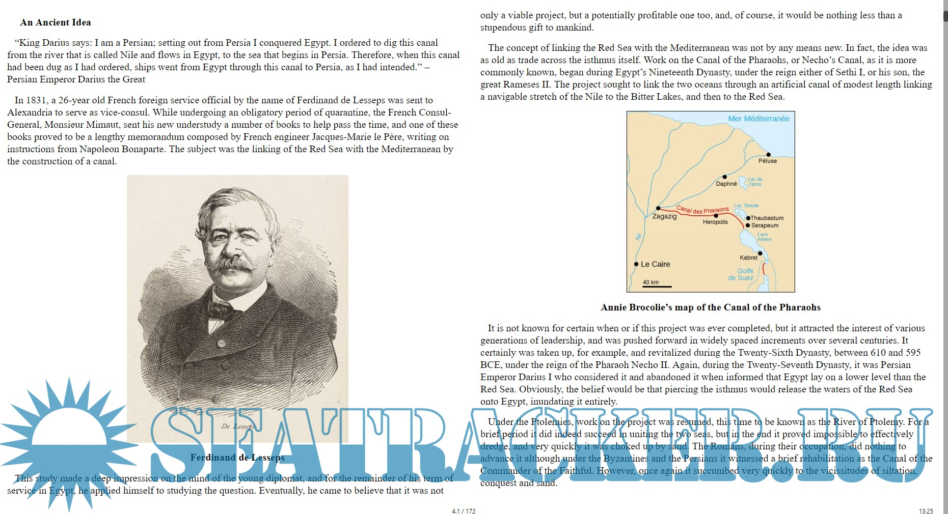 Description: In 1831, a 26-year old French foreign service official by the name of Ferdinand de Lesseps was sent to Alexandria to serve as vice-consul. While undergoing an obligatory period of quarantine, the French Consul-General, Monsieur Mimaut, sent his new understudy a number of books to help pass the time, and one of these books proved to be a lengthy memorandum composed by French engineer Jacques-Marie le Père, writing on instructions from Napoleon Bonaparte. The subject was the linking of the Red Sea with the Mediterranean by the construction of a canal. This study made a deep impression on the mind of the young diplomat, and for the remainder of his term of service in Egypt, he applied himself to studying the question. Eventually, he came to believe that it was not only a viable project, but a potentially profitable one too, and, of course, it would be nothing less than a stupendous gift to mankind.