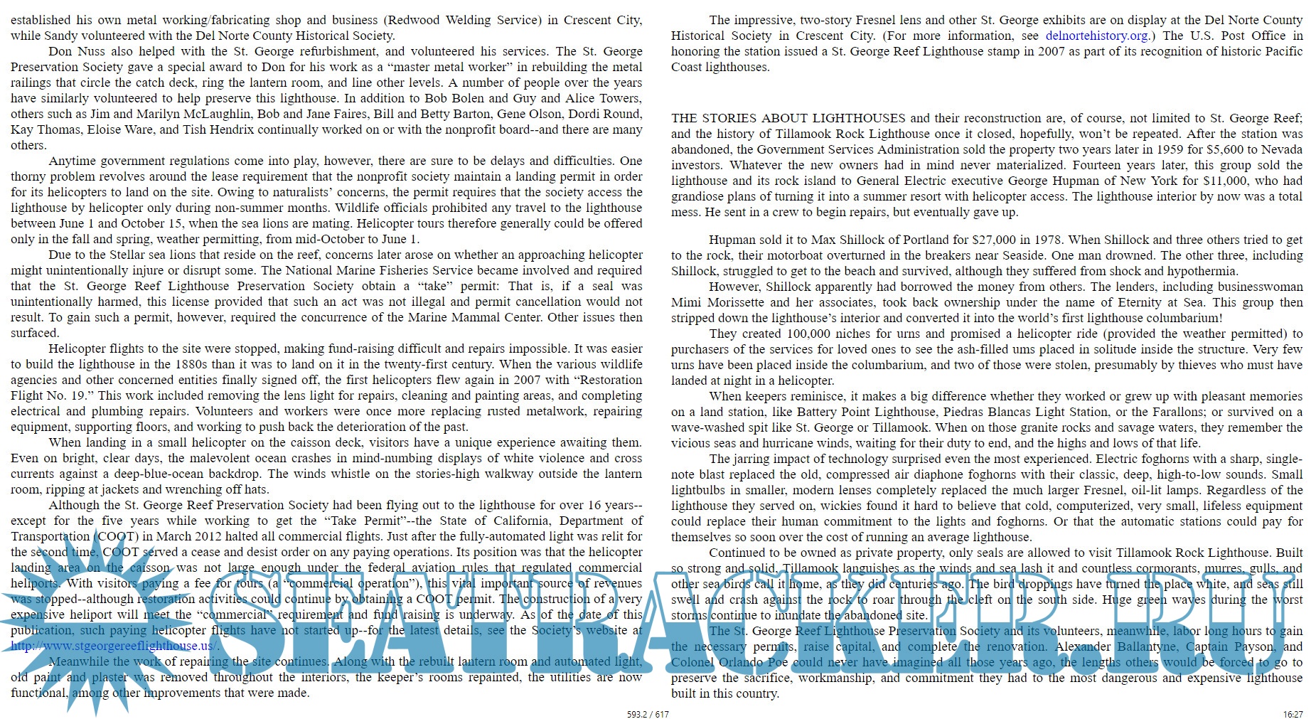 Called “Dragon Rocks” in 1792 by British explorer George Vancouver, the area became known as St. George Reef in the hope that its new namesake might slay the dragon. But the beast claimed its greatest victim in 1865 when the side-wheel steamer S.S. Brother Jonathan sank on one of the rocks with the loss of 225 souls, inspiring an extraordinary effort to make the waters safe. The result took ten years to construct and cost as much as twenty-five typical lighthouses on land.