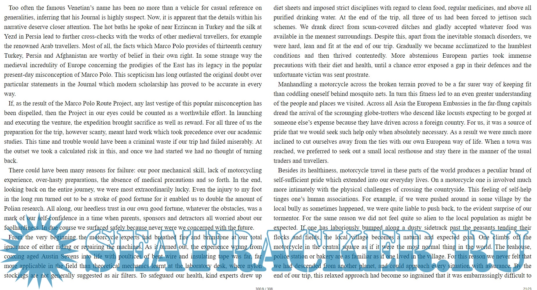 Year: 2018 Language: english Author: Tim Severin Publisher: Lume Books Format: EPUB Quality: eBook Pages count: 308 Description: Marco Polo was one of the greatest explorers of all time. After the best-selling The Brendan Voyage and The Sinbad Voyage, Tim Severin took up the challenge of following in his footsteps. Using the great explorer’s journals as a route guide, Severin followed him all the way from Venice to Afghanistan — on a motorbike. This is his witty and enthralling account of a latter-day caravan through Armenia and Persia, across deserts and mountains, as Severin and his companions overcome crashes, floods, sandstorms and linguistic muddles with zest and ingenuity. Ancient and modern jostle for attention in the bustling towns and panoramic landscapes of Turkey and Afghanistan. Seeking out thirteenth-century Asia, they pass through the Valley of the Assassins to find the village of the Magi. And even with his foot in plaster, Severin takes a camel ride high into the Deh Bakri Pass in search of the famed ‘apples of paradise’. The excitement, the discomfort, and the sheer magic of this epic journey are brought vividly to life by one of Britain’s finest travel writers. Travel alongside Tim Severin as he goes ‘Tracking Marco Polo’.