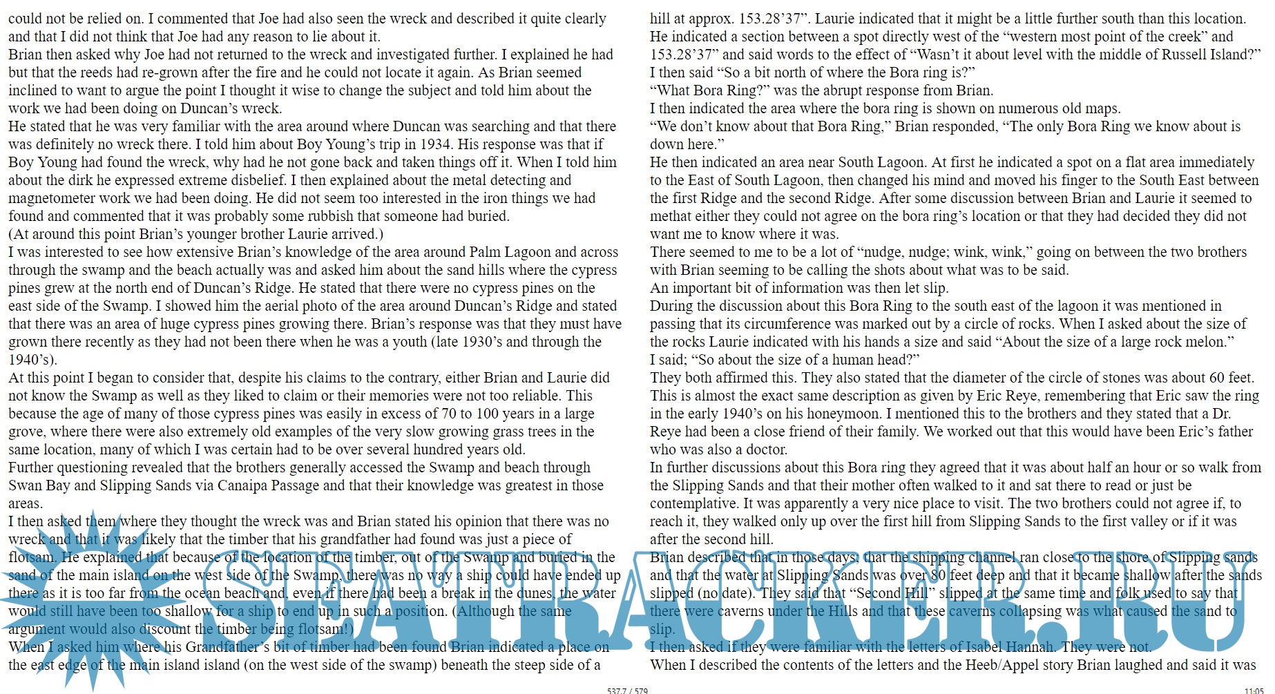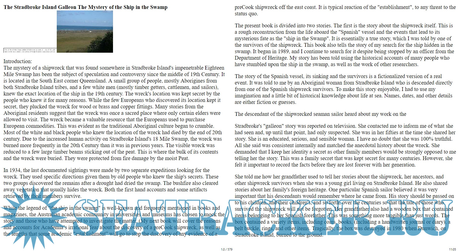 Description: Since the middle of the 19th Century a mysterious shipwreck located somewhere within Stradbroke Island’s vast and impenetrable Eighteen Mile Swamp, in the South East corner of Queensland, has been the focus of much speculation and controversy. In the 19th century a small number of people, mostly Aborigines (from both of the Stradbroke Island tribes) and a few white men (mostly cattlemen, timber getters and sailors) knew where the ship was located. Invariably, for various and different reasons, the people who knew the wreck’s location kept it a close secret. The few Europeans who had somehow stumbled onto its location kept this knowledge to themselves while they plundered the wreck for timber or brass and copper fittings; for the Aboriginal inhabitants many stories seem to indicate the wreck was originally a taboo place where only certain elders were permitted to go.